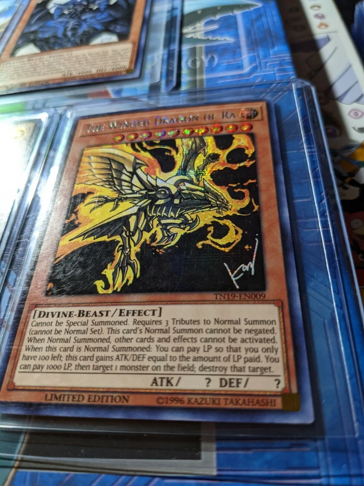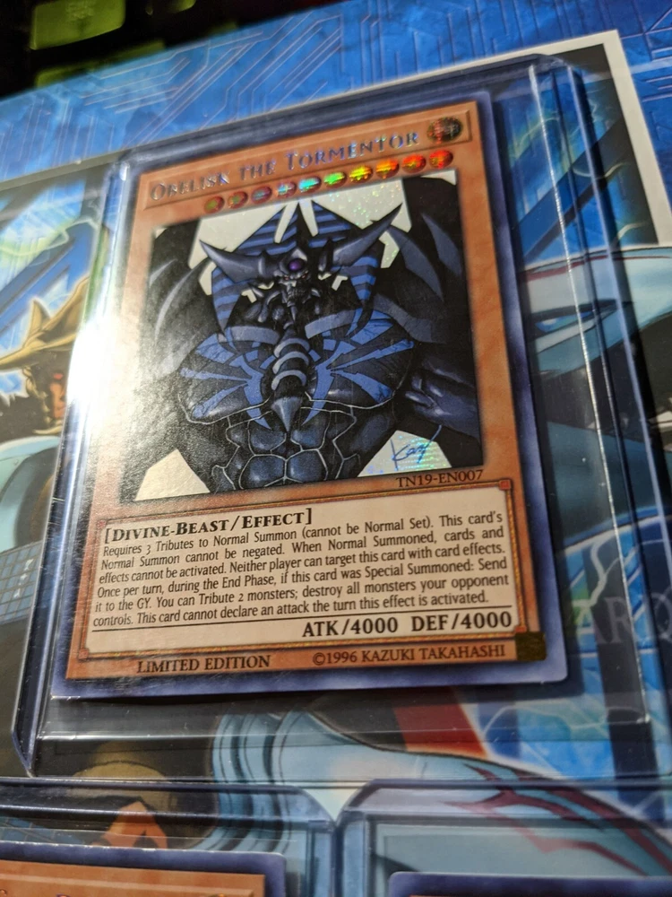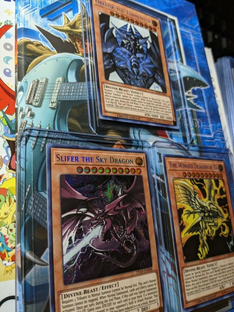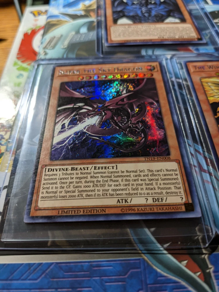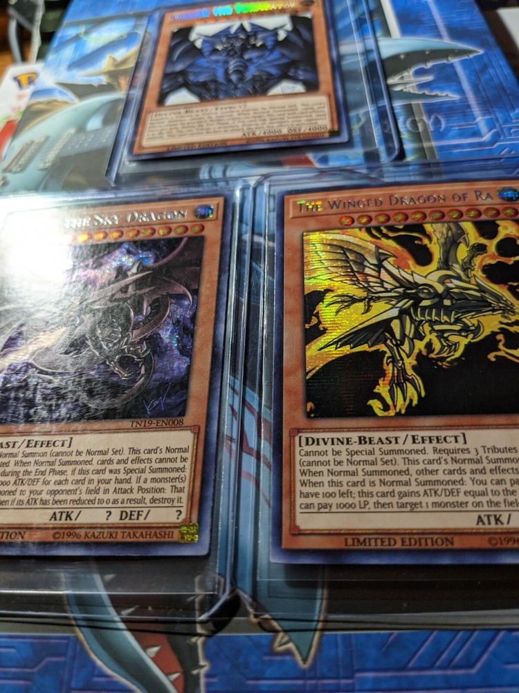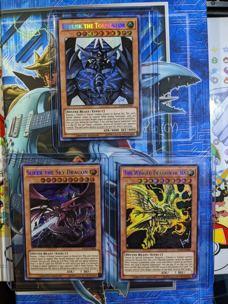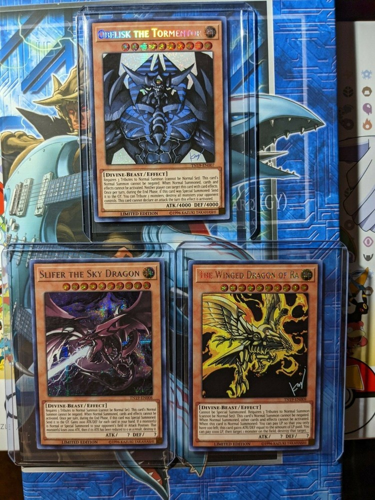 YuGiOh Obelisk Slifer and Ra Bundle - TN19-EN007,EN008,EN009 Yugioh Cards Bundle of Three cards: Obelisk The Tormentor, Slifer The Sky Dragon, And The Winged Dragon of Ra. All Prismatic Secret Rare and all are Scratched on both sides. TN19-EN007, TN19-EN008, TN19-EN009 Feel free to reach out if you have any questions or concerns! I ship all cards in a single sleeve along with a plastic toploader as seen in the last image in the listing (For Free!). I will also protect this in between two pieces of foam board to help prevent bending during shipping. Card(s) will be mailed in a bubble mailer not an envolope with Free Tracking! Free Shipping on orders above $5 USD! Bundled shipping is available and highly encouraged for huge discounts! International Buyers please note, I am based in the United States and ship globally through eBay's Global Shipping Program. You are responsible for any additional import charges. Any Trading Card orders will also recieve a FREE random Non-holo trading card from any year from my personal collection (sometimes additional chance of bonus items especially for multi-card orders)! Are you a Trading Card Collector or TCG player? Save my store! I'll be listing my entire collection as quickly as I can! Pokemon, Yugioh, Magic the Gathering and custom metal cards! All Trading Cards are stored safely and cared for. They have been stored in a plastic card case and kept in a Storage Box, protected all these years. They were sleeved over time slowly. Please see images for condition as I try to ensure proper lighting/angles to show any and all possible scratches and other potential damage that you should know about. What you see is what you get!