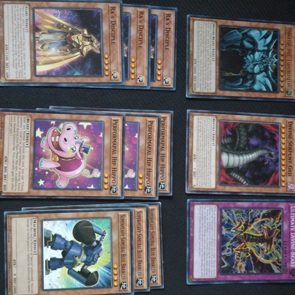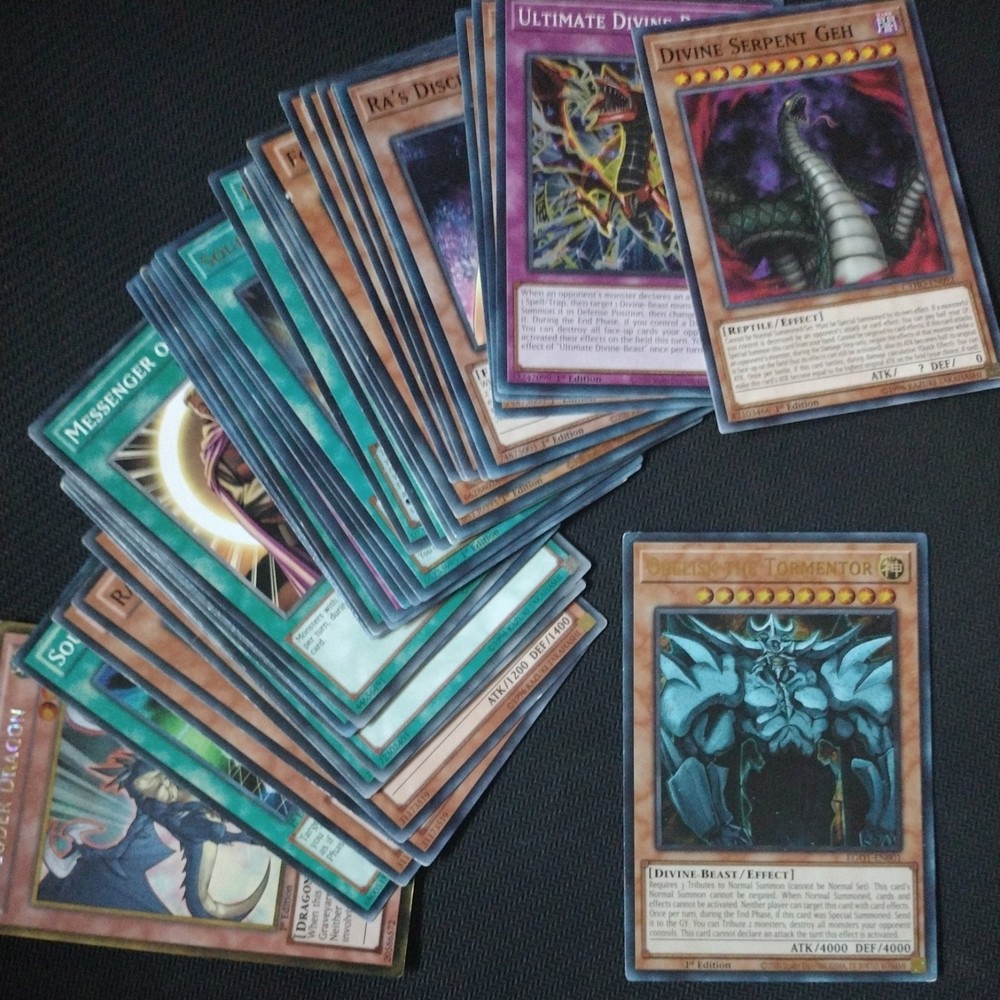 obelisk the tormentor deck to crush your friends and enemies with TOTAL: 40 cards 1 Obelisk the Tormentor [EGO1] 1 Divine Serpent Geh [DLCS] 1 Ultimate Divine-Beast [EGS1] 3 Ra's Disciple [EGO1] 3 Performapal Hip Hippo [SP15] 1 Shield Wing [LC05] 1 Fortress Warrior [5DS3] 1 Millennium Seeker [EGS1] 1 Reactor Slime [EGS1] 1 Battlin' Boxer Veil [PRIO] 1 Goldilocks the Battle Landscaper [ETCO] 1 Fist of Fate [EGO1] 1 Divine Evolution [EGO1] 2 Soul Crossing [EGO1] 3 Call of the Haunted [SDCS] 1 March of the Monarchs [CBLZ] 1 The True Name [EGS1] 1 Draw of Fate [EGS1] 1 Gold Sarcophagus [SDAZ] 1 Messenger of Peace [LC03] 1 Card Advance [EGS1] 1 Exploder Dragon [PGLD] 1 Negate Attack [SBCB] 3 Swords of Revealing Light [SDBE] 1 Soul Exchange [YSKR] 3 Rai Rider [PHSW] 3 Superheavy Samurai Blue Brawler [MP15] if you have any questions please let me know and I'll get back to you as soon as I can