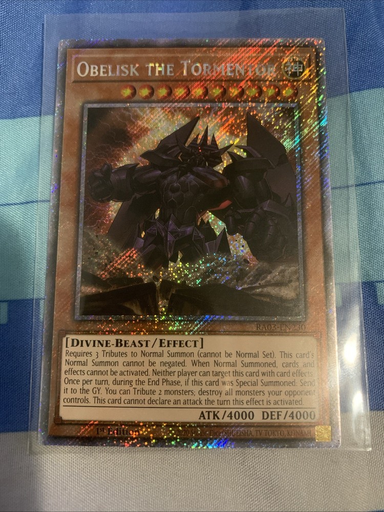 Unleash the power of the Pharaoh with "Obelisk The Tormentor," a Platinum Secret Rare card from the Quarter Century Bonanza set. This iconic piece is a must-have for any serious collector or player in the Yu-Gi-Oh! TCG universe, manufactured by the legendary Konami. The card's exceptional rarity and the allure of its alternate art design make it a standout addition to any collection. Whether you're looking to enhance your deck or treasure a piece of Yu-Gi-Oh! history, "Obelisk The Tormentor" promises to be a centerpiece of your gaming experience. With its impressive presence, this card is sure to command attention and respect from opponents and collectors alike.