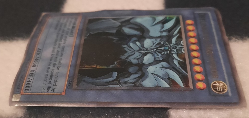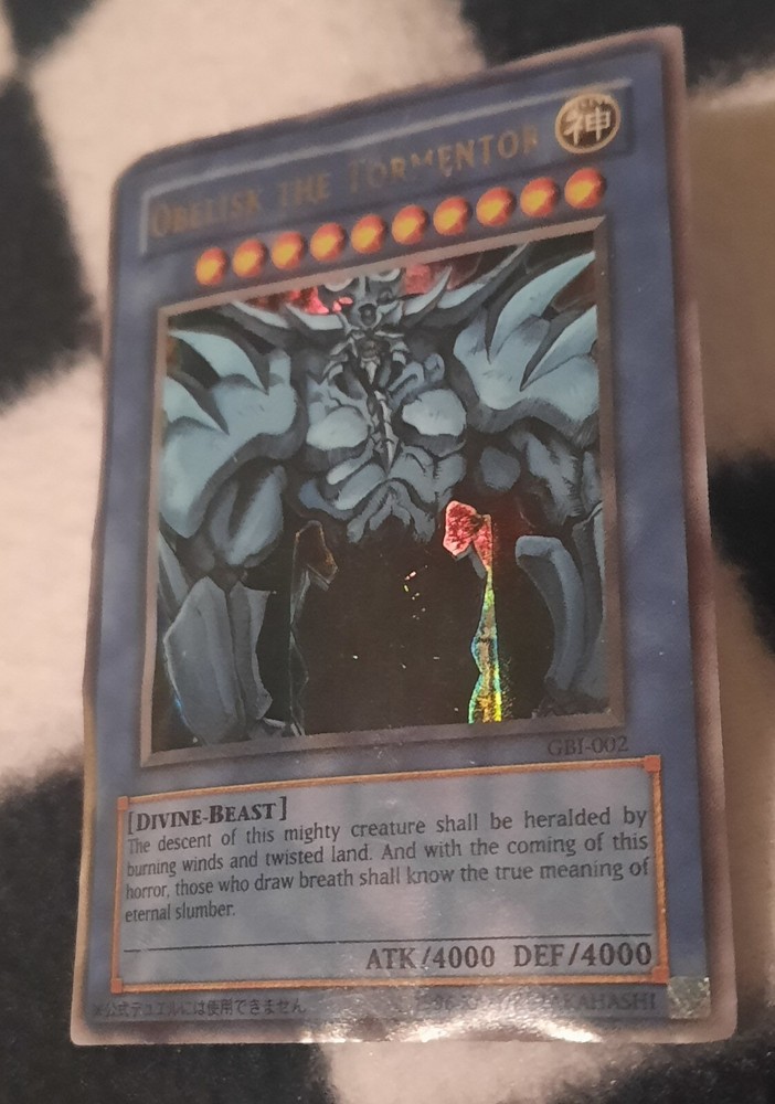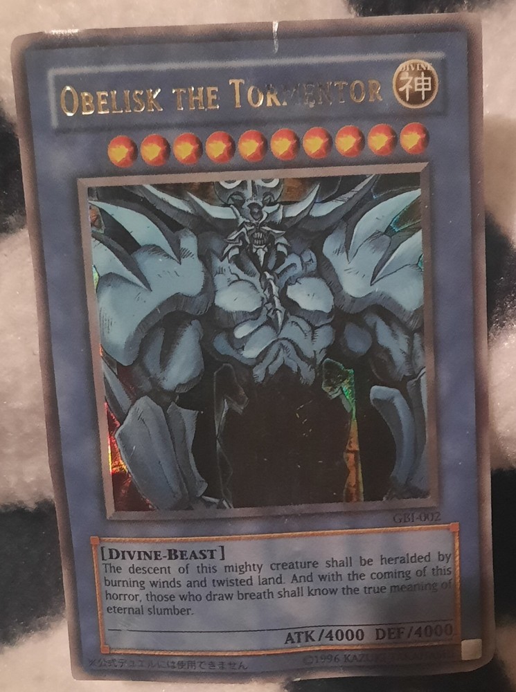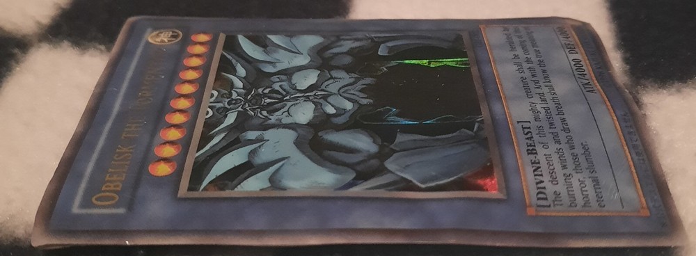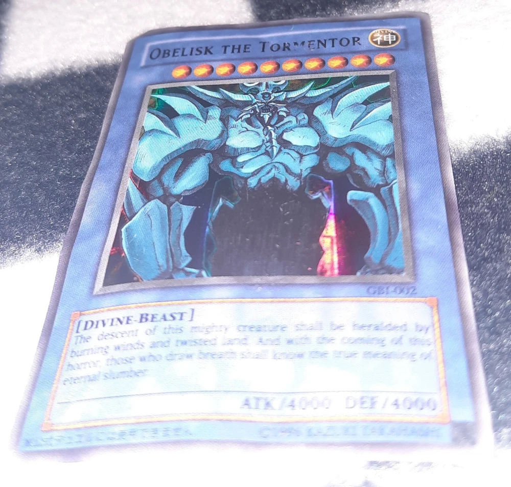 Up for sale is one Obelisk The Tormentor Yu-Gi-Oh! Card. Card has several imperfections but is still intact and would be good for any Yu-Gi-Oh fan's collection. Please see photos. See listing photos for condition of items. No returns. Please ask all questions before purchasing. All best offers appreciated and considered. Please pay within 48 hours of winning auction or acceptance of best offer. Thanks for looking. We are a family selling on eBay to help with expenses. We try to do a good job for our buyers. Please allow 2 business days for handling time and also allow additional time for USPS to complete delivery. Delivery typically can take up to 9 days after shipment. We would appreciate being given the opportunity to help if there are any issues. Before leaving negative or neutral feedback please contact us! Thanks very much for purchasing from us!