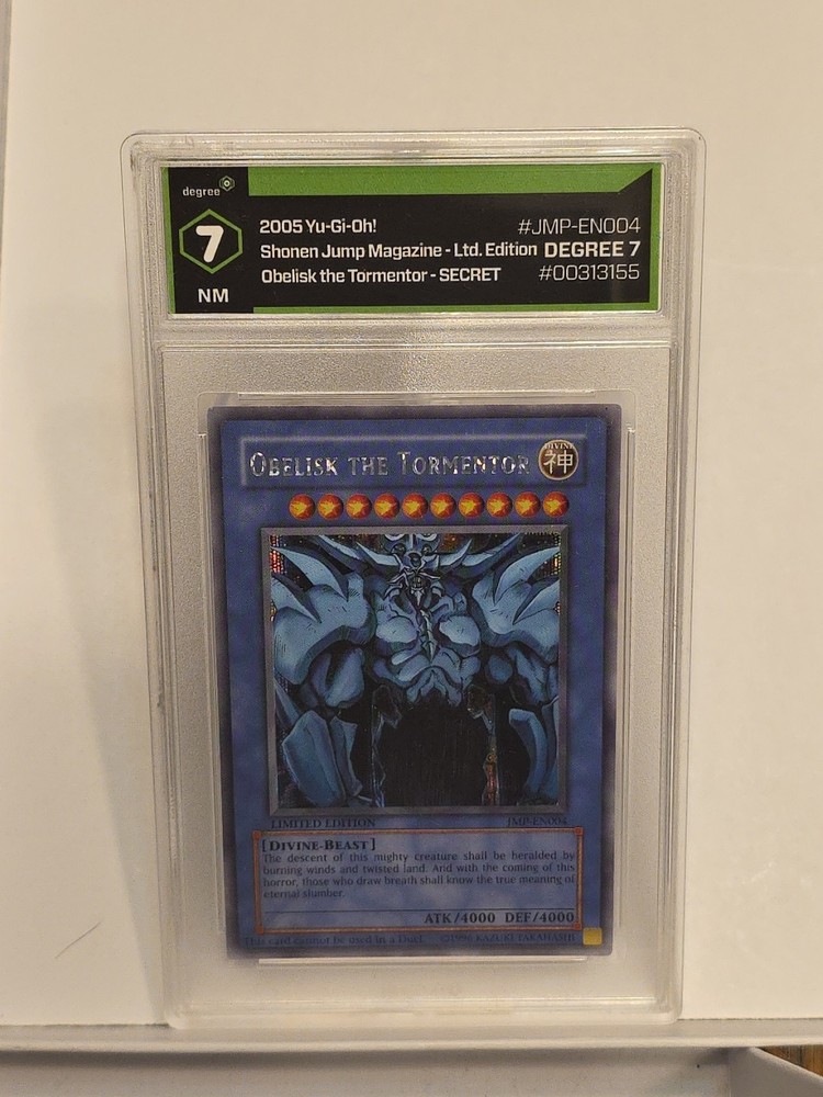 This limited edition Obelisk The Tormentor card is a must-have for any Yu-Gi-Oh! TCG collector. The card features a stunning holo finish and is in English language. The card is part of the Shonen Jump Promo set and has the card number JMP-EN004. It is a secret rare card with features that include being a promo card. The manufacturer of the card is Konami and it is categorized under Toys & Hobbies, Collectible Card Games, and CCG Individual Cards. View photos for more details. Happy shopping