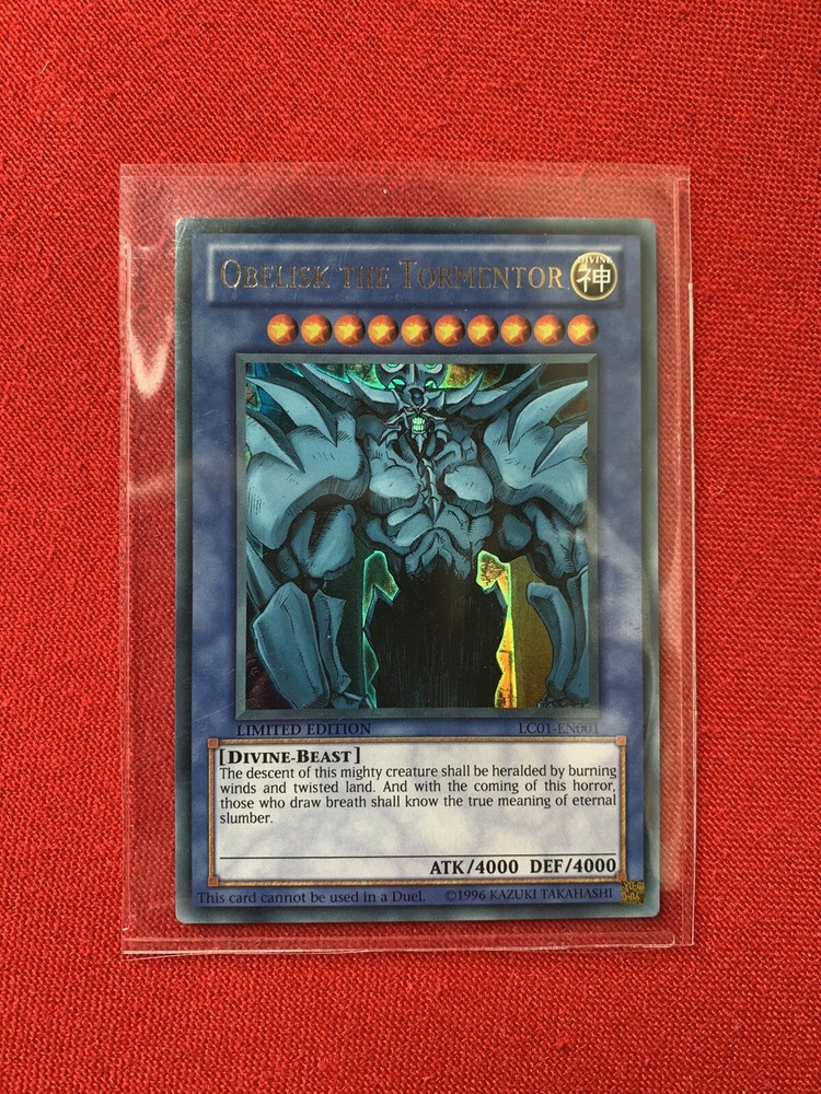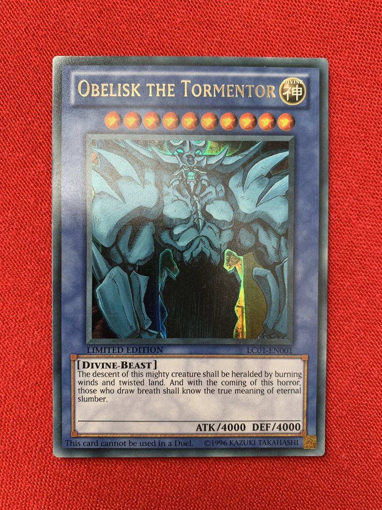 Obelisk The Tormentor (LC01-EN001) Yu-Gi-Oh! Divine Beast Card - Limited Edition. The card is in very condition (please see the images) Obelisk The Tormentor (LC01-EN001) - Divine-Beast - Limited Edition Holo - Very Good Condition (very light edge and corner wear) The item will be dispatched with Royal Mail 2nd Class Letter