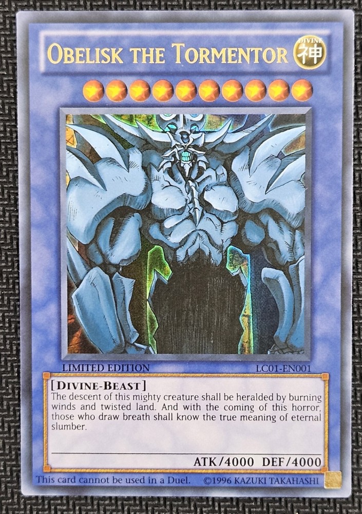 1996 YuGiOh! Legendary Collection 1 Obelisk The Tormentor Card #LC01-EN001 Please see pictures for more details. We do combine shipping if more than one item is won or bought. Thank you for looking and please follow for more Pokemon and TCGs!!