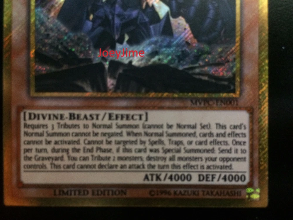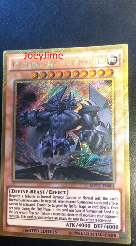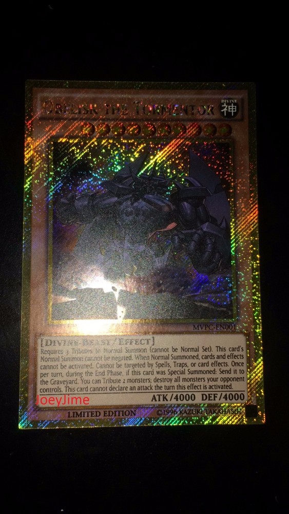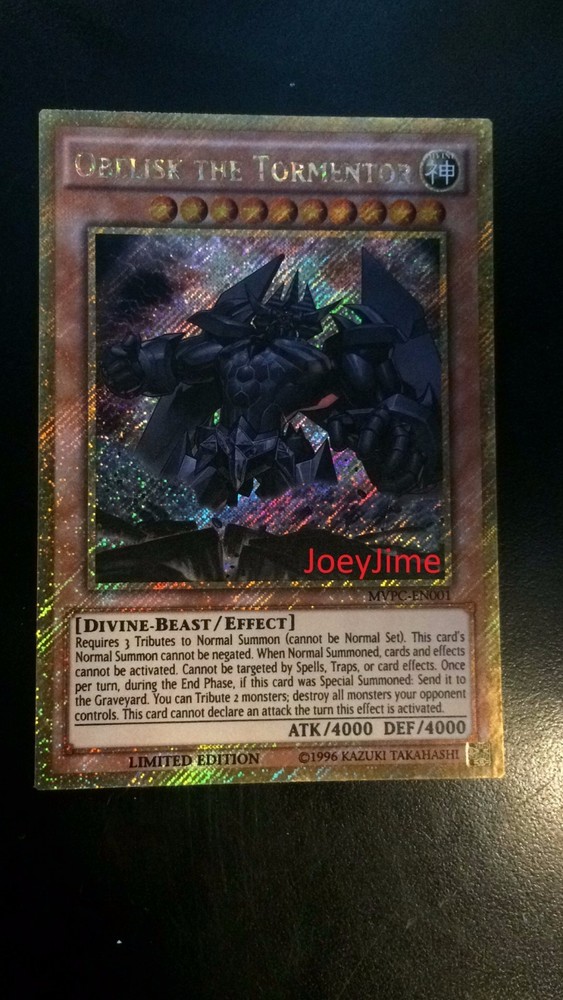 This is the holographic Obelisk the Tormentor (Limited Edition) MVPC-EN001Yu-Gi-Oh: Dark Side of Dimensions card. It is in mint condition and will be shipped in a top loader! The sealed package (showed in the first picture to the left) only contains one card! If interested in buying a bulk amount, please feel free to message me! :)