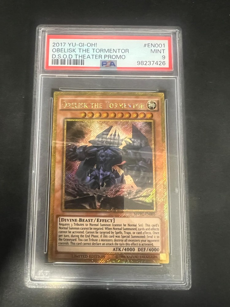 You are buying: Obelisk The Tormentor MVPC-EN001 PSA Graded 9 Gold Rare Yugioh TCG Language: English Store Policies If you have any questions or can't seem to find something that you want please do not hesitate to contact us. We do not list our entire inventory on eBay. We will respond to all questions within one business day. Info: Items will be shipped within 1 business day upon receiving cleared payment. We ship Monday through Friday in order to get the item(s) to you as quickly as possible Before leaving neutral or negative feedback, please contact us beforehand so we can discuss the issue. Feel free to message me with any questions you have regarding this auction or my policies. Grading Scale: This is the scale we use when listing cards. Please read carefully and check the listing title's condition so you know what to expect: Near Mint (NM) - Cards with this grade will contain no more than two micro blemishes. (A micro blemish is a small almost invisible scratch or ding) . NM cards do not have visible signs of play which means no whitening, no fading, no edge wear, no corner or side dings, no creases, no tears, no rips, no small pieces missing, and no inking of the face or borders of the card. Lightly Played (LP) - Cards with this grade will contain more than two micro blemishes. They may have a dinged corner, mild edge wear or whitening, and they may contain some fading. LP cards do not contain the following types of damage: no creases, no tears, no rips, no small pieces missing, and no inking of the face of the card. Moderately Played (MP) - Cards with this grade will contain some form of the following: dinged corners, edge wear or whitening, fading, small creases or bends that do not extend across the entire card, and they may also be signed by someone. MP cards do not contain the following types of damage: no tears and no rips. Heavily Played (HP) - Cards with this grade will contain some if not multiple of the following: dinged bent or missing corners, heavy edge wear, extreme fading, large creases or bends that can extend across the entire card, and they may also be signed drawn on or coloured in. HP cards do not contain the following types of damage: no tears and no rips. Damaged - Cards with this grade have it for a reason. Not for high-level events unless they are extra deck cards. Cards with this grade have destroyed or missing corners, heavy edge wear, extreme fading, multiple large creases or bends that can extend across the entire card. They can be signed, drawn on, coloured in, ripped, torn, severely water damaged, and missing pieces. Shipping Information: We ship Monday through Friday, barring national holidays during which the United States Postal Service is closed. The shipping and handling time is one business day once payment is cleared. For shipping in the United States: First Class Mail : FREE for all singles. Orders over $20 (exc. sales tax) receive free tracking. Priority Mail with Delivery Confirmation : $7.99: for 2-3 Day shipping USPS Priority Mail Express: $32.99 for 1-2 Day shipping For international orders: We will ship to almost any country. The buyer is responsible for any duty or customs tax. The cost of shipping is based on the shipping address and will be shipped with tracking and will be covered under PayPal's Seller/Buyer Protection program. Return Policy: You must return items sold and fulfilled by Phantasm Gaming within 14 days of delivery to be eligible for a refund. Returns which are damaged in the mail due to improper return packaging will not receive a refund. The buyer will pay for return shipping. We will process a full refund for all items returned in their original condition.