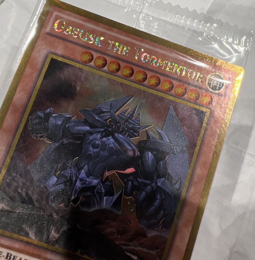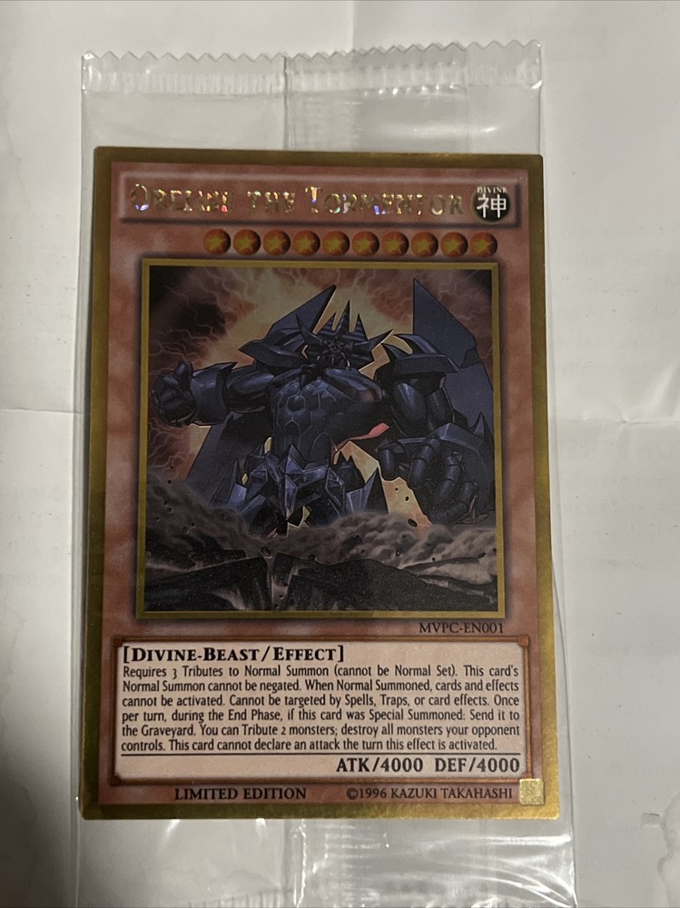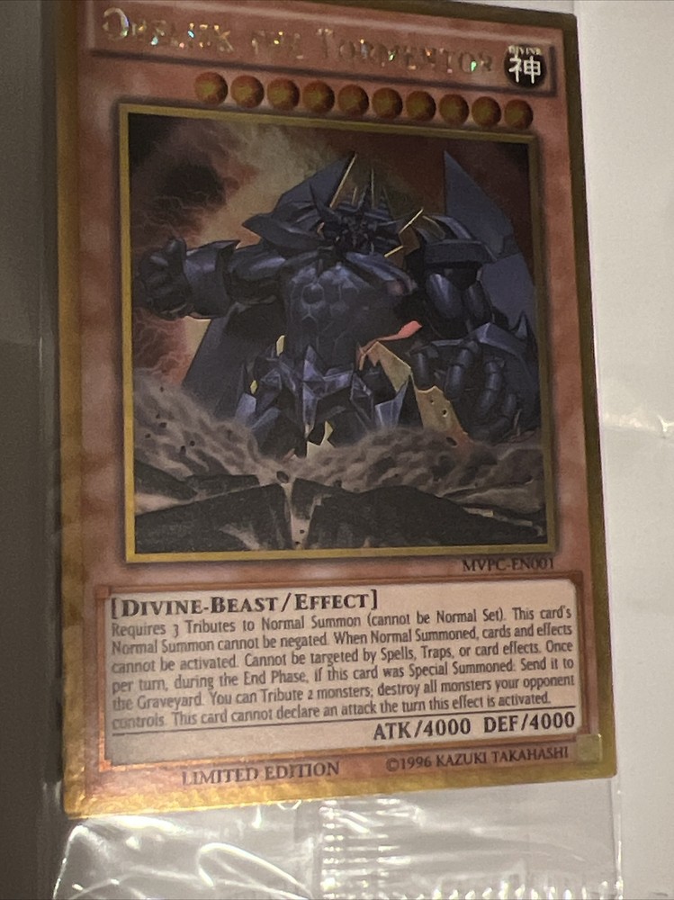 This Yu-Gi-Oh! card is a gold secret rare Obelisk The Tormentor from the promo set of Darkside Dimensions MVPC-EN001. The card features a divine-beast type creature with an attack power of 4000. It was manufactured by Konami in 1996 and is in English language. This card is a must-have for collectors and fans of the Yu-Gi-Oh!