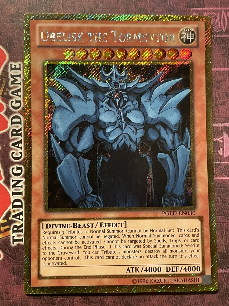 1x Obelisk The Tormentor (PGLD-EN030) Gold Secret Rare Unlimited Edition. Condition is very lightly played. Shipped with USPS. Fast shipping with tracking and will be sent in a top loader. Thank you!...