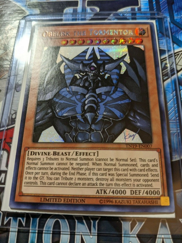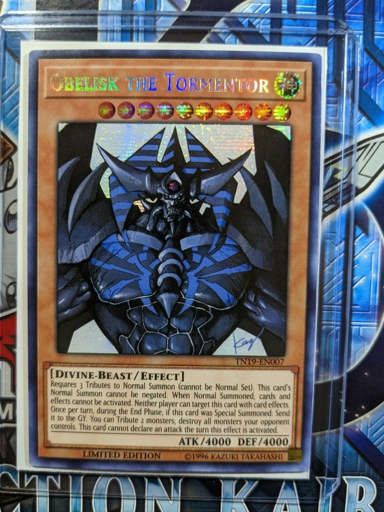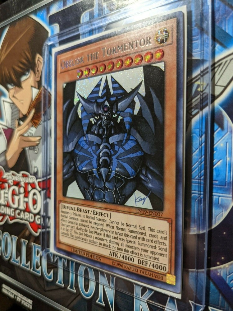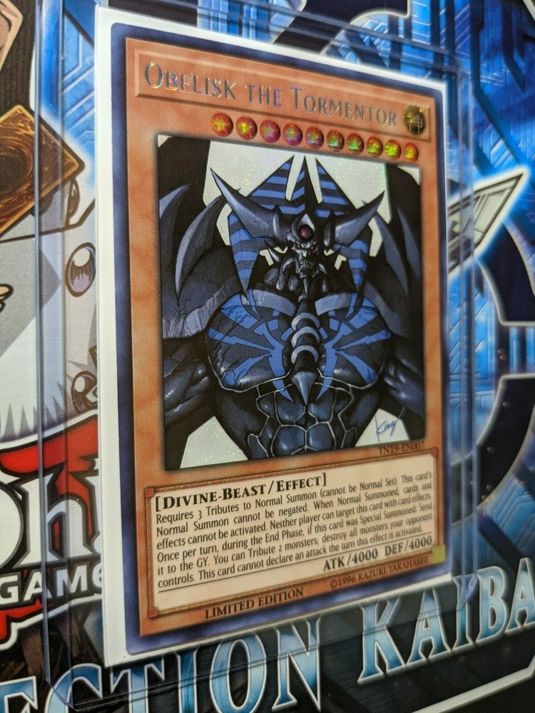 Obelisk The Tormentor TN19-EN007 - Prismatic Secret Rare Limited Edition Yugioh Card Feel free to reach out if you have any questions or concerns! I ship all cards in a single sleeve along with a plastic toploader as seen in the last image in the listing (For Free!). I will also protect this in between two pieces of foam board to help prevent bending during shipping. Card(s) will be mailed in a bubble mailer not an envolope with Free Tracking! Free Shipping on orders above $5 USD! Bundled shipping is available and highly encouraged for huge discounts! International Buyers please note, I am based in the United States and ship globally through eBay's Global Shipping Program. You are responsible for any additional import charges. Any Trading Card orders will also recieve a FREE random Non-holo trading card from any year from my personal collection (sometimes additional chance of bonus items especially for multi-card orders)! Are you a Trading Card Collector or TCG player? Save my store! I'll be listing my entire collection as quickly as I can! Pokemon, Yugioh, Magic the Gathering and custom metal cards! All Trading Cards are stored safely and cared for. They have been stored in a plastic card case and kept in a Storage Box, protected all these years. They were sleeved over time slowly. Please see images for condition as I try to ensure proper lighting/angles to show any and all possible scratches and other potential damage that you should know about. What you see is what you get!