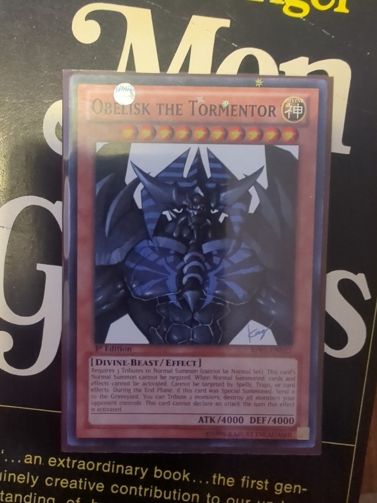 This rare and highly sought-after card features Obelisk the Tormentor, a Divine-Beast creature from the Yu-Gi-Oh! TCG game. The card is made of high-quality card stock with a holographic finish, and is an Ultra Rare 1st Edition card. It is perfect for collectors and fans of the game, and is autographed by 5ban Graphics with authentication from Beckett Authentication Services (BAS). The card is standard size and comes from the Shonen JUMP set, with the card number BP01-EN021. It is an effect type card and is manufactured by Konami in Japan. The card is suitable for ages 6 and up, and is not vintage or graded. It is a must-have for any serious collector of Yu-Gi-Oh! TCG cards.