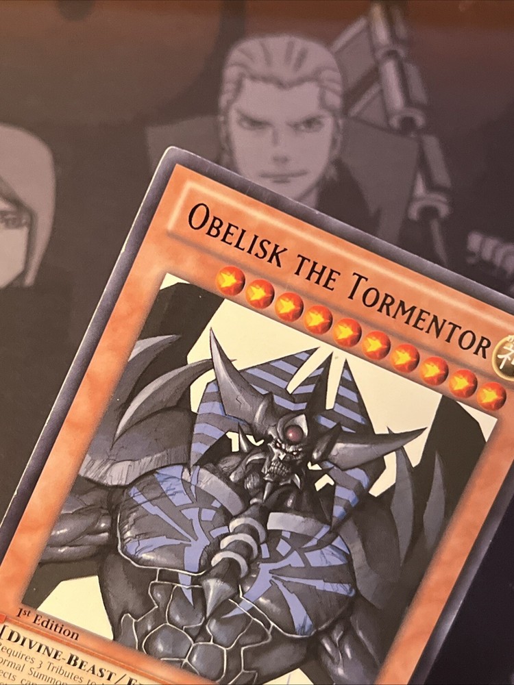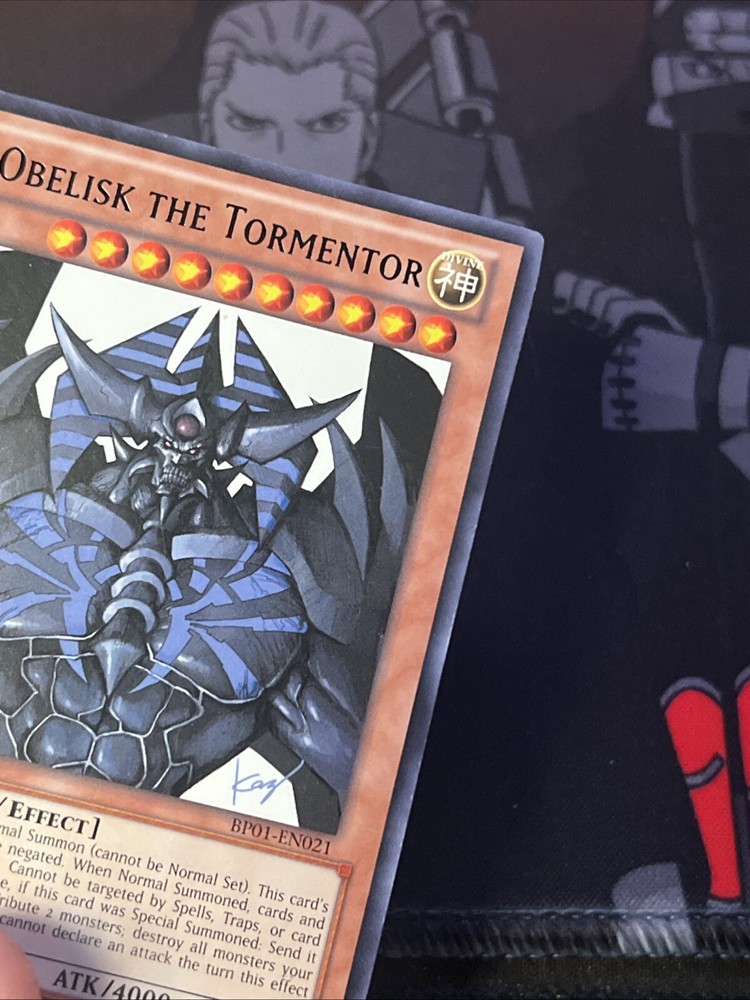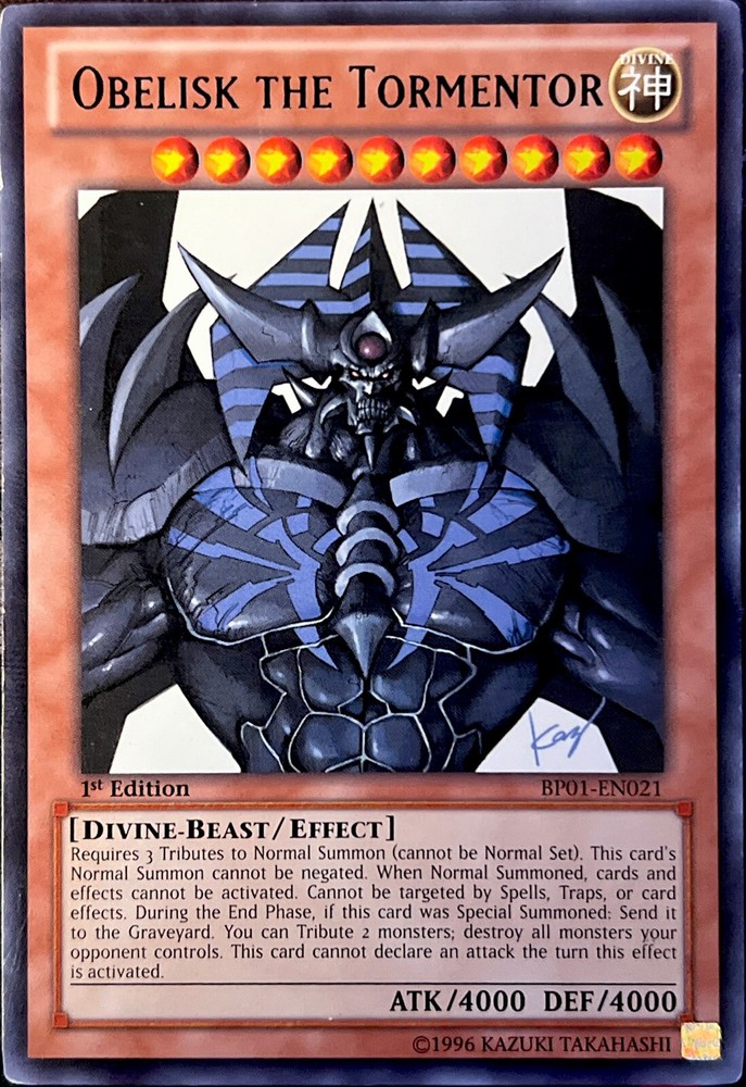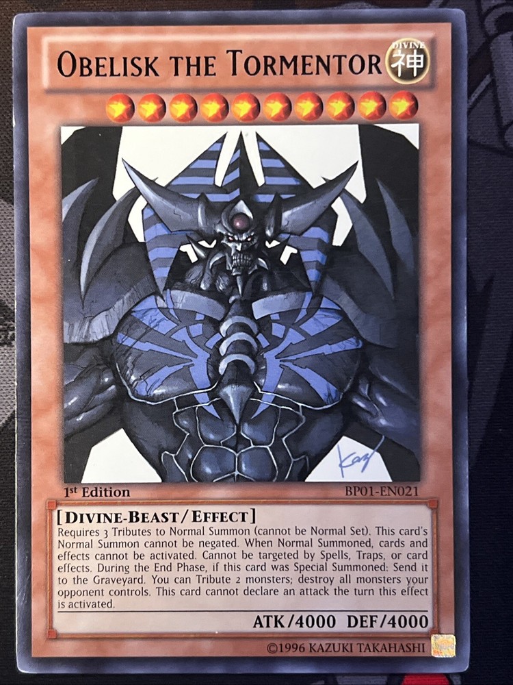 The product is a rare 1st Edition Obelisk The Tormentor card from the Battle Pack: Epic Dawn set of the Yu-Gi-Oh! TCG. This Divine-Beast creature card has 4000 Attack/Power and 4000 Defense/Toughness, making it a powerful card in gameplay. Manufactured by Konami, it is an English language card with the card number BP01-EN021. The card features an Effect ability, adding depth to strategic gameplay in the collectible card game.