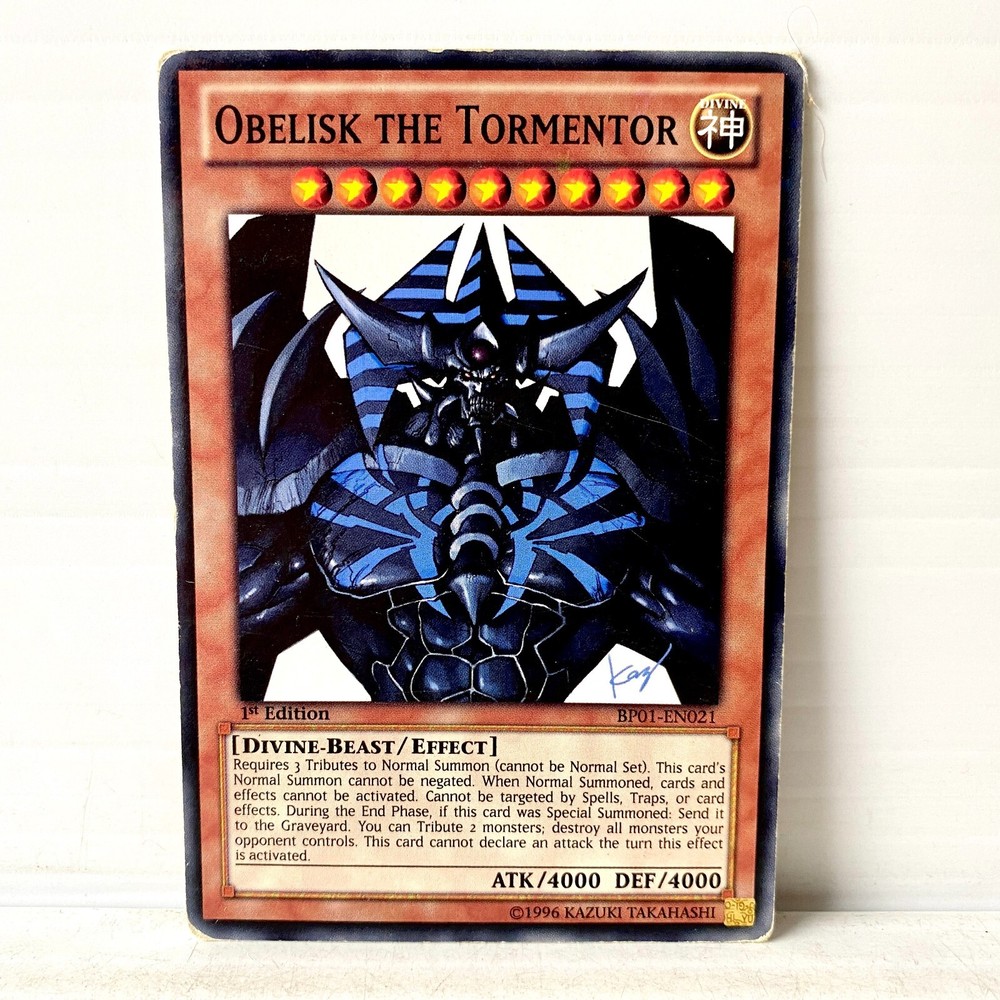 Obelisk the Tormentor BP01-EN021 - Rare 1st Edition - Yu-Gi-Oh! TCG EXC / Excellent Condition Mint - Booster Fresh no visible damage. Typically PSA 8.5-10. Near Mint (NM) - Storage wear with possible surface scuffings or extremely minor border wear, no creases. Looks mint in pocket display. Typically PSA 7-8.5. Excellent (LP/EXC) - Minor wear such as a few surface scuffings and/or hairline scratch, minor border wear, may have small crease/stress marks. Looks Nearmint-Mint in pocket display. Typically PSA 4-7. Good, Very Good (MP) - May have Scuffings or hairline scratches, some border wear, possible bends or creases. Looks great in pocket display. Typically PSA 2-4. Used (P) , Played - Scratches may be present, possibly evident border wear, there may be creases. No tears. Does not look scrunched. Does not look like it has gone through the wash. Very playable and looks ok in a storage pocket display. Typically PSA 1.5-2. DAMAGED (DMG) - More damage. There may be significant scratches, multiple creases. The card will still be recognisable and is a great filler in pocket sleeves as a place-holder for a collection to be "semi-complete" until a suitable quality card is found. Typically PSA 1. The card will be posted in a sleeve and top-loader. Free postage! If you require any additional photos or have any questions, please don’t hesitate to ask. The item will be sent bubble wrapped to ensure its safety. Thank you :)