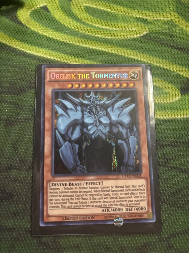 The product is a Limited Edition Secret Rare "Obelisk The Tormentor" card from the Yu-Gi-Oh! TCG. It is a Standard sized Monster card with a Holo finish, featuring the manufacturer Konami. The card is in English and is part of the CT13-EN002 series, suitable for ages 6 and above. It is not autographed and is a highly sought-after collectible item.