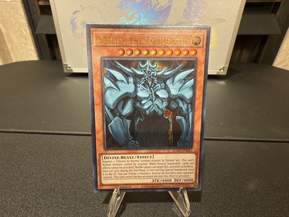 The product is a Yu-Gi-Oh! TCG card from the Egyptian God Deck featuring Obelisk the Tormentor. This Ultra Rare card is part of the 1st Edition and has the attributes of being a Divine-Beast creature with 4000 Attack and Defense points. The card is in English and manufactured by Konami, with the card number EGO1-EN001. Its features include being an Effect card with the unique character of Ego.