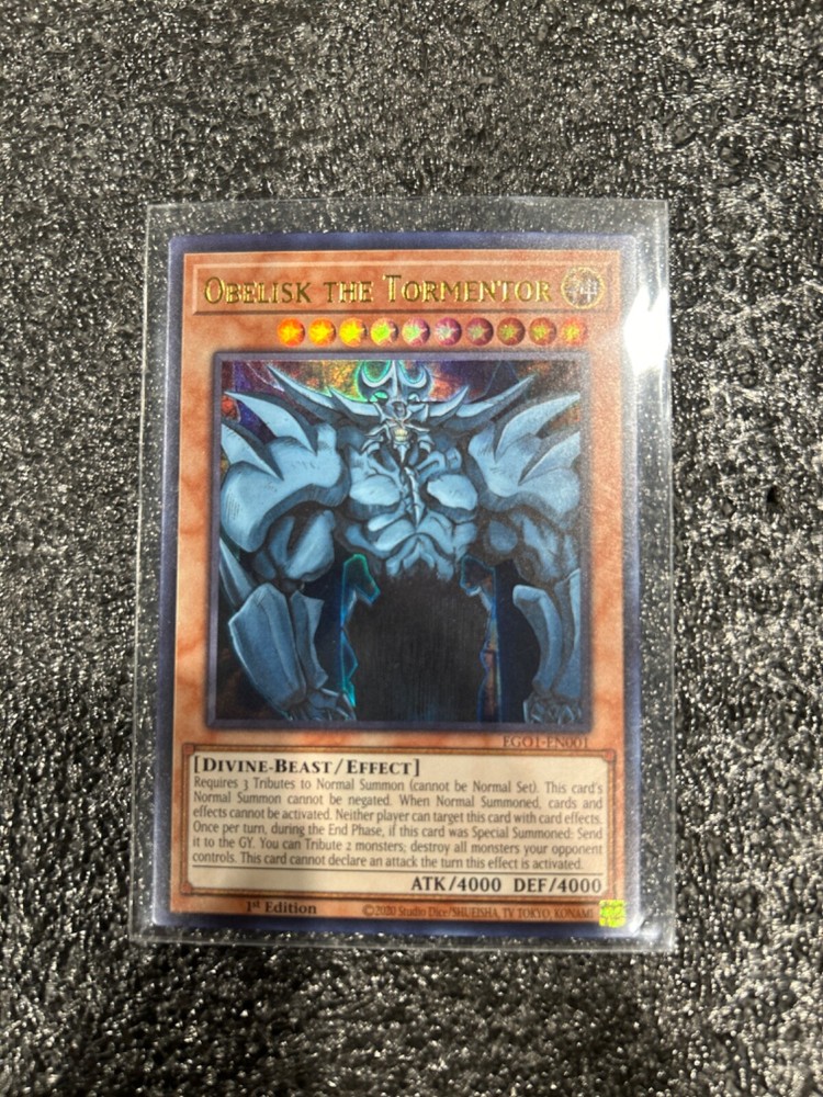 Unleash the power of the divine-beast with this ultra rare 1st edition Obelisk the Tormentor card from the Yugi set of Yu-Gi-Oh! TCG. This holo card is printed on high-quality card stock and features the iconic Ego character. Perfect for collectors and players alike, this card is a must-have for any Yu-Gi-Oh! enthusiast. Its rarity and unique features make it a valuable addition to any collection. Don't miss out on the opportunity to own this incredible card!