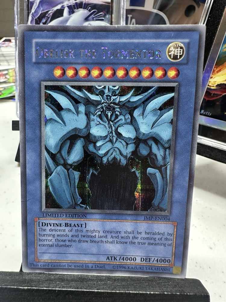 The product is a limited edition Yu-Gi-Oh! trading card, Obelisk the Tormentor, from the Shonen Jump Magazine Promos set. This Secret Rare card features a Divine-Beast creature type with a high Attack/Power and Defense/Toughness of 4000. Manufactured by Konami in Japan, the card is in English with a Holo finish, making it a desirable collectible for fans of the Yu-Gi-Oh! Trading Card Game.