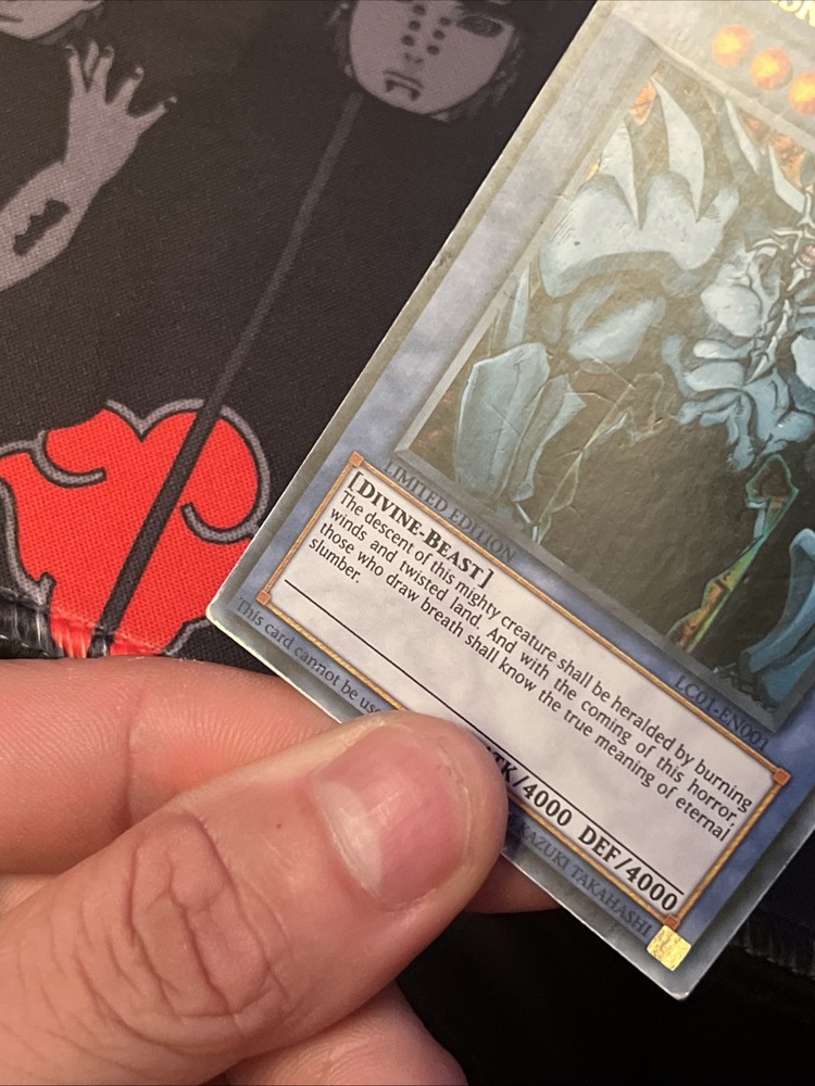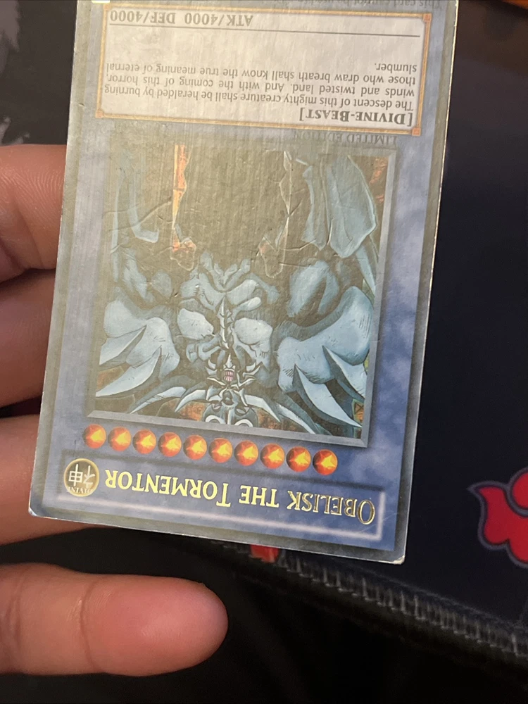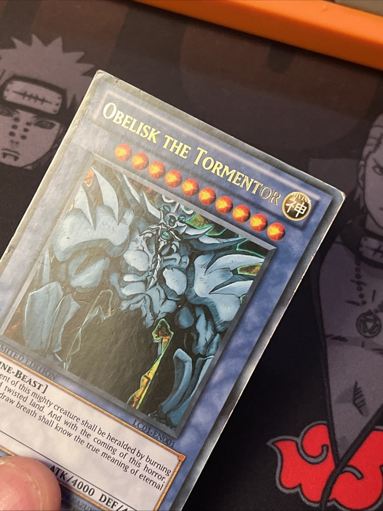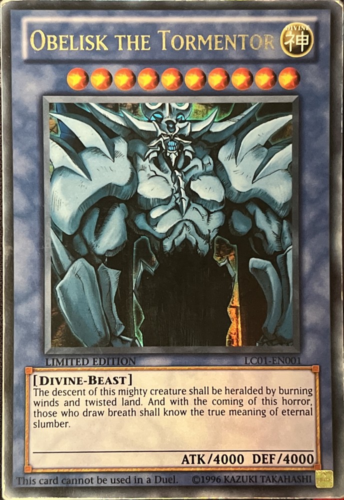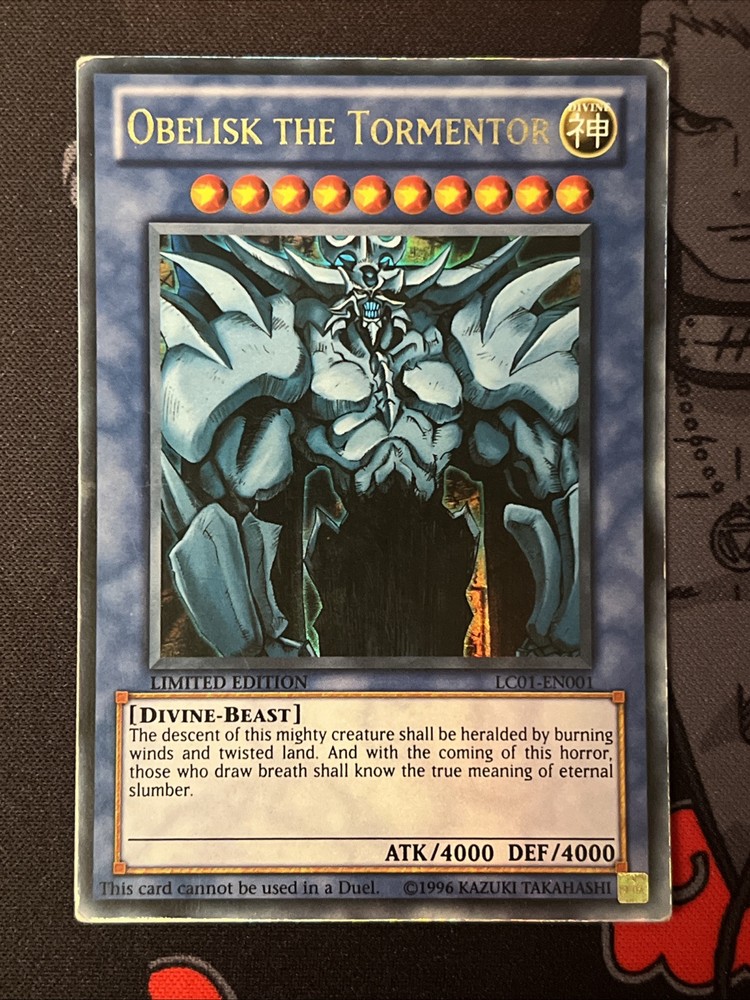 The product is a limited edition Ultra Rare Obelisk The Tormentor trading card from the Yu-Gi-Oh Legendary Collection 1 set. This Divine-Beast monster card has a powerful 4000 Attack and 4000 Defense, making it a formidable addition to any Yu-Gi-Oh! TCG deck. Manufactured by Konami, this English-language card features an Effect attribute and is highly sought after by collectors and players alike. The card number is LC01-EN001.