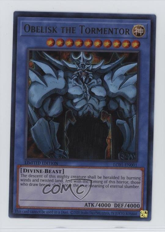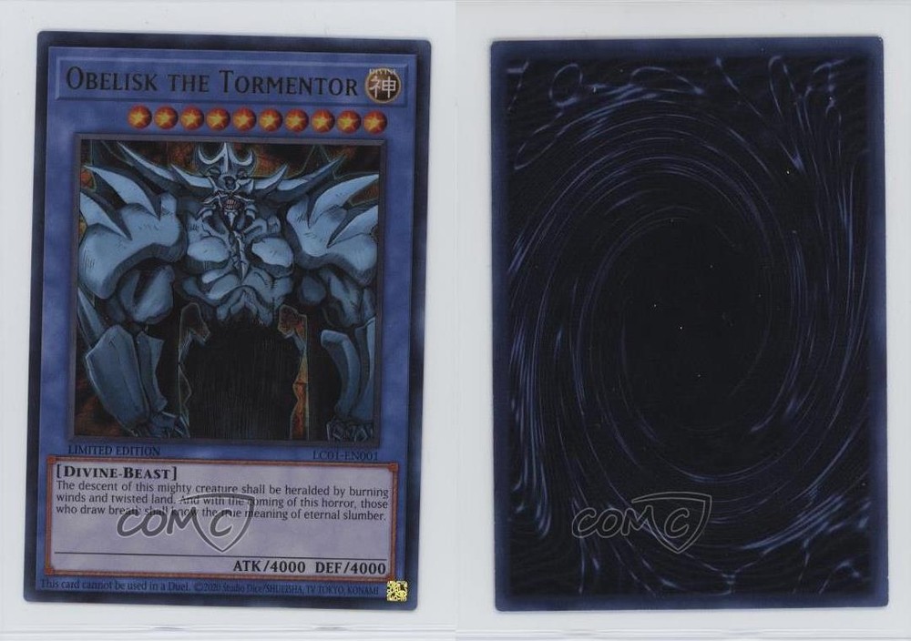 2023 Yu-Gi-Oh! - Legendary Collection 25th Anniversary - [Base] - Limited Edition #LC01-EN001 Obelisk the Tormentor COMC Item: 237037737 - YuGiOh Card - Featuring Obelisk the Tormentor Search for more: 2023 Yu-Gi-Oh! - Legendary Collection 25th Anniversary Search for more: 2023 Yu-Gi-Oh! - Legendary Collection 25th Anniversary - [Base] - Limited Edition View all of our Listings Auctions Buy It Now About Us Located in the beautiful Pacific Northwest, COMC (Check Out My Cards) is the world's largest consignment service for trading card singles. More than 10,000 people have used our consignment service to list over 50 million trading cards. Find out how we can help you consign your items on eBay by contacting us through eBay messaging. COMC -- "The Safe & Easy Way to Buy & Sell" Raw Condition for Modern Cards Unless otherwise noted, raw modern cards are listed in Near Mint-Mint condition or better. A NM-MT card appears to be Mint at first glance, but upon closer inspection, may exhibit some of the following: minor print defects (e.g. roller marks, print line, dimple), minor scratches, slight edge wear, and slight corner wear. Centering is clearly visible in the images provided and does not factor into our condition assessment. Raw Condition for Vintage Cards Unless otherwise noted, raw vintage cards are listed in Excellent condition or better. An EX card may exhibit some of the following: minor rounding of corners, surface wear, print defects, light scratches, and slight edge wear/chipping. Centering is clearly visible in the images provided and does not factor into our condition assessment. Domestic Shipping Combined shipping for multiple items is available. To receive combined shipping, please ensure all desired items are in your eBay shopping cart before proceeding to checkout. eBay limits orders to 40 items per order. We automatically combine multiple orders placed on the same day. If you place multiple orders on the same day, please contact us to request a refund of applicable shipping costs. Signature confirmation may be required on invoices over $400. All cards are protected and shipped securely. International Shipping COMC offers eBay's International Shipping (EIS) for international orders under $2,500* (see country exceptions below). All duties and import fees are paid at checkout; in the rare event that there are additional import fees upon delivery, these are borne by the buyer. EIS packages route through a shipping hub in Erlanger, KY before shipping to their final destination. Please note that EIS does not allow for combined shipments. The shipping rates are determined by eBay and cannot be adjusted. *Maximum sale price exceptions: Colombia, Kuwait ($2,000); Taiwan ($1,539); Chile, Costa Rica, Guatemala, Honduras, Trinidad and Tobago ($1,000); Antigua and Barbuda, Aruba, Belize, Dominica, Grenada, Philippines, Saint Kitts and Nevis, Saint Lucia, Montserrat, Turks and Caicos Islands ($500); Dominican Republic, El Salvador ($200). Please request a shipping quote through eBay messaging for orders that exceed the maximum sale price supported by eBay's International Shipping. You will be responsible for all duties and import fees for international orders shipped outside the EIS. All cards are protected and shipped securely. Payment COMC does not accept offers on our cards through our eBay storefront. COMC utilizes eBay’s managed payments system. If you are experiencing difficulties making a payment, please contact eBay for assistance. Return Policy Returns are only accepted on the rare occasion the item is not as described. If you are making a return, please initiate the return process through eBay so a mailing label can be provided for you. Prior to listing, our expert team carefully assessed this item to represent it accurately. Please review the description and high-definition images prior to purchasing to ensure this item meets your satisfaction. We welcome you to contact us if you have further questions about this item. Trust and Integrity COMC carefully assesses each item consigned to us to prevent fraudulent items from entering the marketplace. If you believe an item offered on COMC may be fraudulent, please contact us with details so we can investigate the issue. Items we determine are outside our supported items policy may be removed. Last Modified: 5/30/2025 12:09:49 PM PDT
