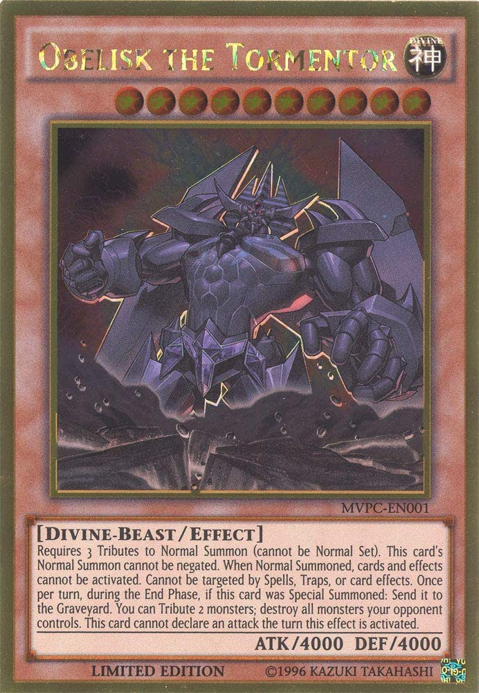 Details Card: Obelisk the Tormentor Rarity: Gold Rare Set: Yu-Gi-Oh! The Dark Side of Dimensions Blu-ray & DVD promotional card Number: MVPC-EN001 Edition: Limited