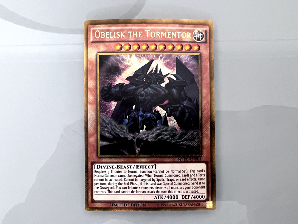 Obelisk the Tormentor | MVPC-EN001 | Secret Gold Rare | LIMITED EDITION | YuGiOh! Condition is "Near Mint". Dispatched with Royal Mail 2nd Class Letter. Posted in Ultra Pro Top Loader. • • • • • • • Near Mint is a card with minimal handling or play wear. (NM) May Have: Slight Edgewear Slight Scuffing Slight Indentation Minor Scratches Slight Defect