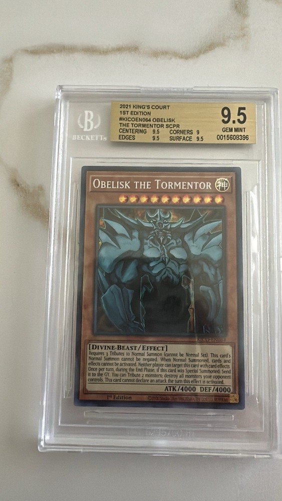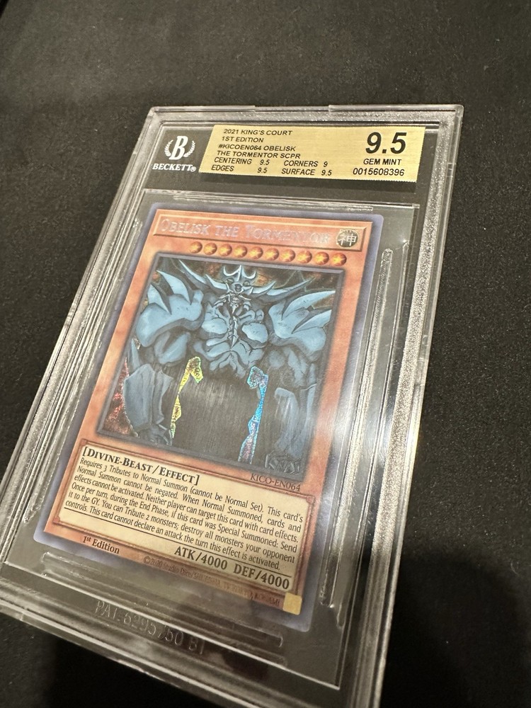 Yu-Gi-Oh Set: King’s Court Year: 2021 Rarity: Secret Pharaoh Rare Card: Obelisk The Tormentor Description: Hieroglyphics visible in holo. POP 2!! No BGS 10s exist....