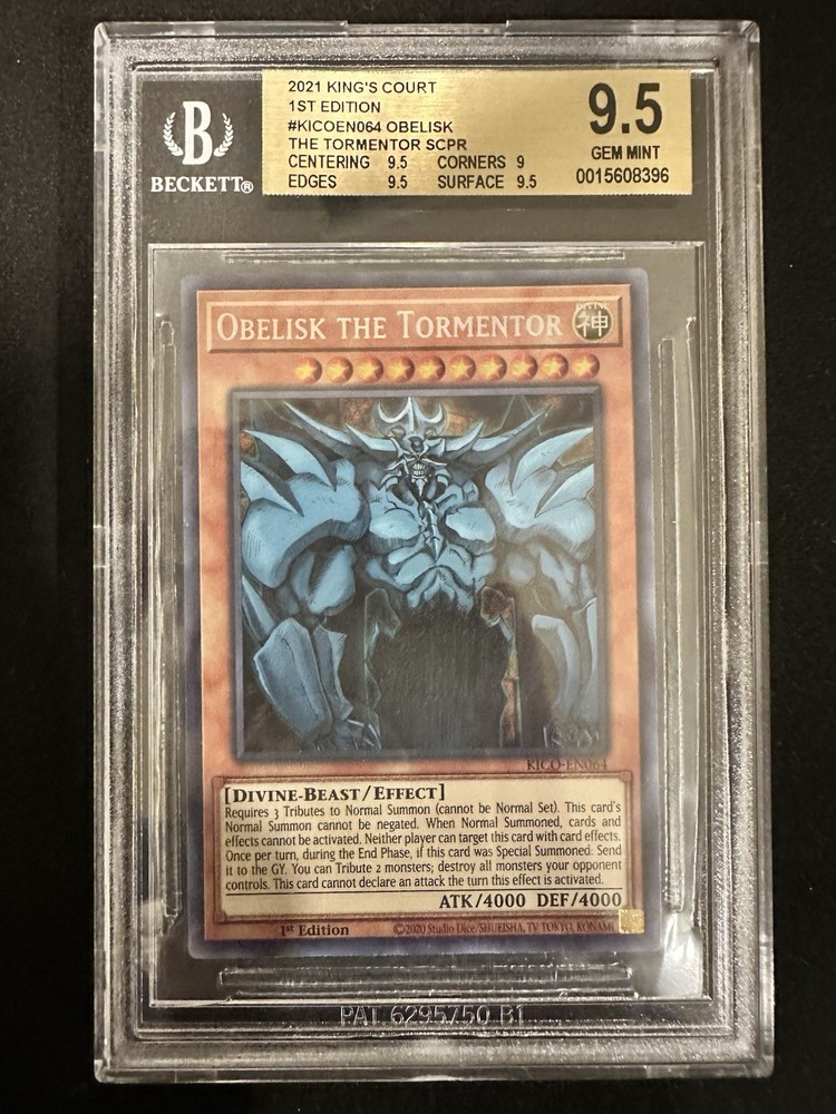 Yu-Gi-Oh Set: King’s Court Year: 2021 Rarity: Secret Pharaoh Rare Card: Obelisk The Tormentor Description: Hieroglyphics visible in holo. POP 2!! No BGS 10s exist.