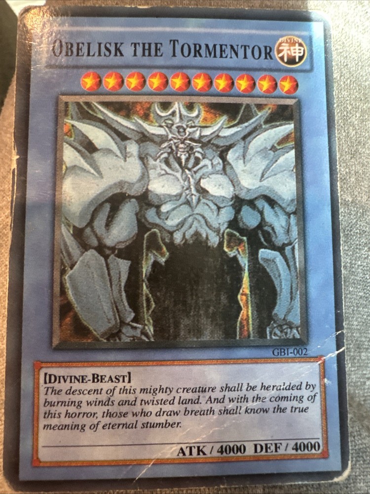 The Obelisk the Tormentor card is a highly sought after collectible in the Yu-Gi-Oh! trading card game community. It is part of the GBI series, with the card number GBI-002, and is classified as a Secret Rare card. With attributes of Light color and Divine-Beast monster type, this card has impressive stats of 4000 Defense and 4000 Attack. Manufactured by Konami, the card is in English language and features unlimited edition. A valuable addition to any Yu-Gi-Oh! card collection, Obelisk the Tormentor is a powerful and sought after card for players and collectors alike.