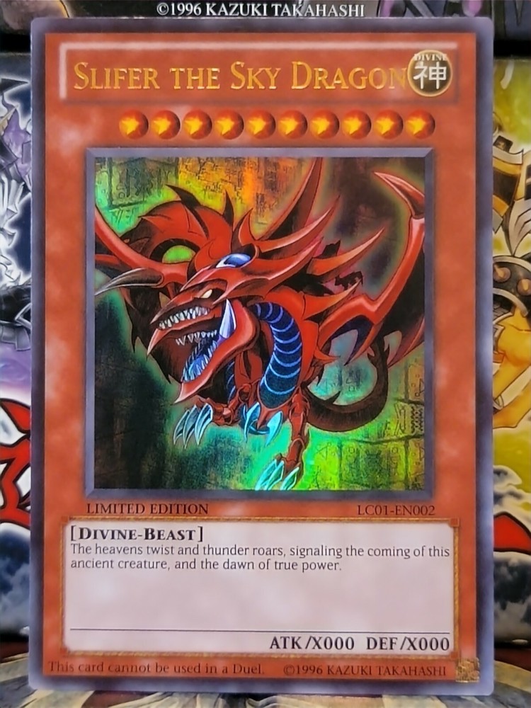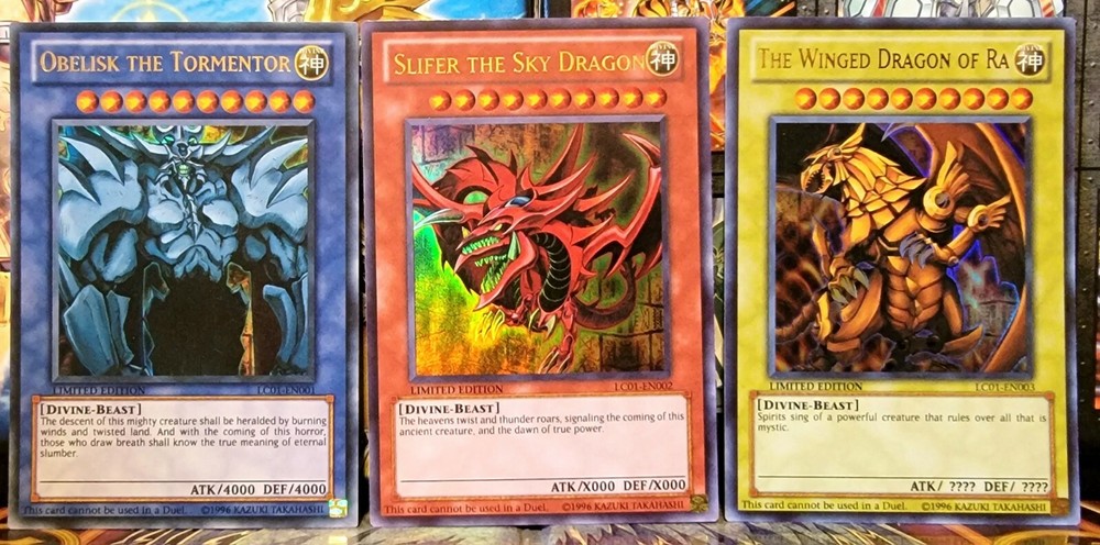 This Yu-Gi-Oh! TCG card set includes three Ultra Rare Divine-Beast monster cards: Obelisk the Tormentor, Slifer the Sky Dragon, and The Winged Dragon of Ra. These Limited Edition promo cards are part of the Yu-Gi-Oh! Legendary Collection and have a foil finish. The card set is ungraded but is in near mint or better condition. Perfect for collectors and fans of the Yu-Gi-Oh! franchise, this CCG individual card set is a must-have. The card names are "Obelisk The Tormentor," "Slifer the Sky Dragon," and "The Winged Dragon of Ra." Don't miss this opportunity to add these rare, powerful, and iconic cards to your collection.