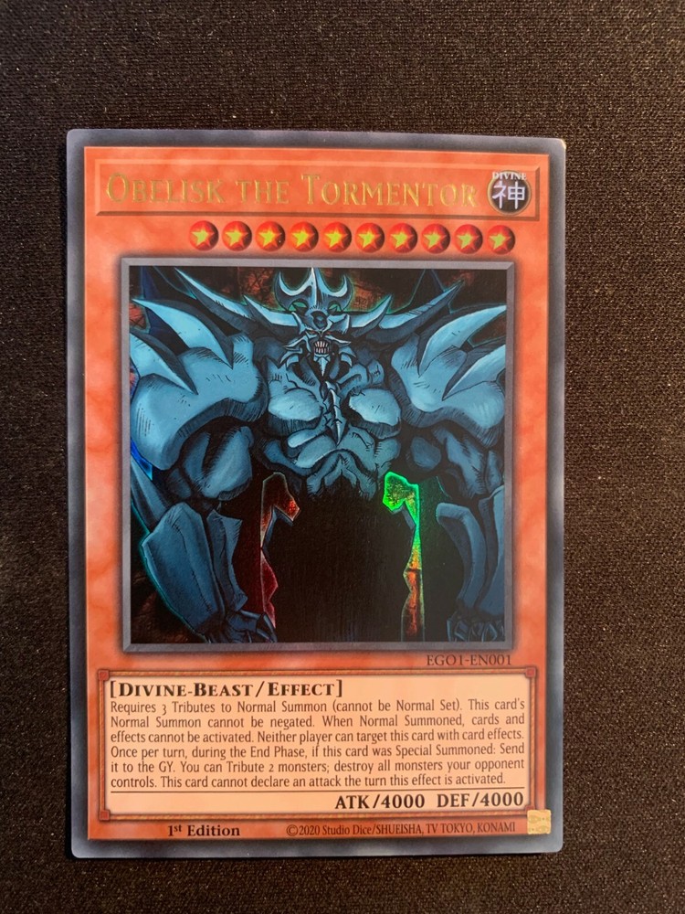 Obelisk the Tormentor - Ultra Rare - EGO1-EN001 - Yu-Gi-Oh - N/M Card is 1st Edition Card is in Near Mint Condition Pulled from a Recently Opened Structure Deck Combined Shipping is offered on all of my TCG Listings. When Checking out with multiple cards in your cart, click ‘Request total from seller’. This will allow me to combine the shipping for multiple cards if purchased together. If this does not show up for you, then please message me and I’ll create a listing for your order. Any Further Questions Please Message Me Thanks