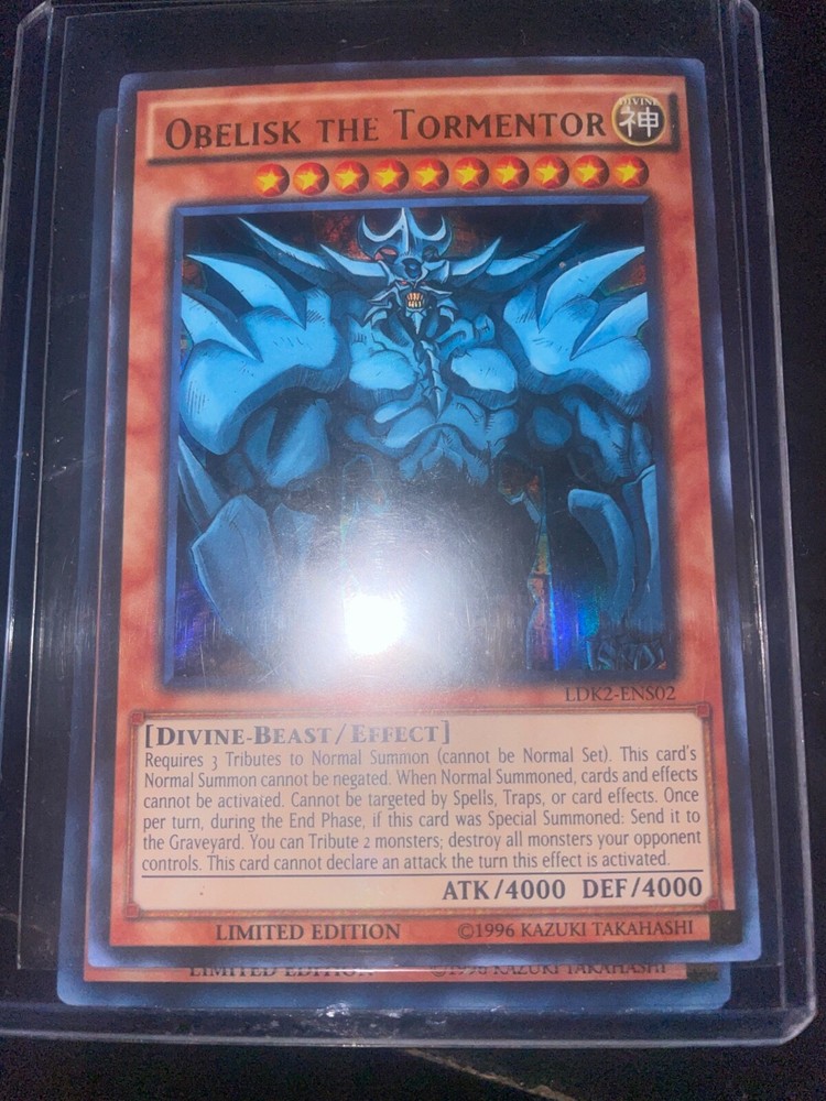 This Ultra Rare Obelisk the Tormentor is a game-changer! Its stunning artwork and massive 4000 ATK/DEF make it a powerhouse in any duel. As a Divine-Beast, it dominates the field, and the GBI-002 rarity makes it a prized collectible. Perfect for competitive play or displaying in your collection—pure Yu-Gi-Oh! nostalgia at its finest. A must-own for fans and duelists alike!