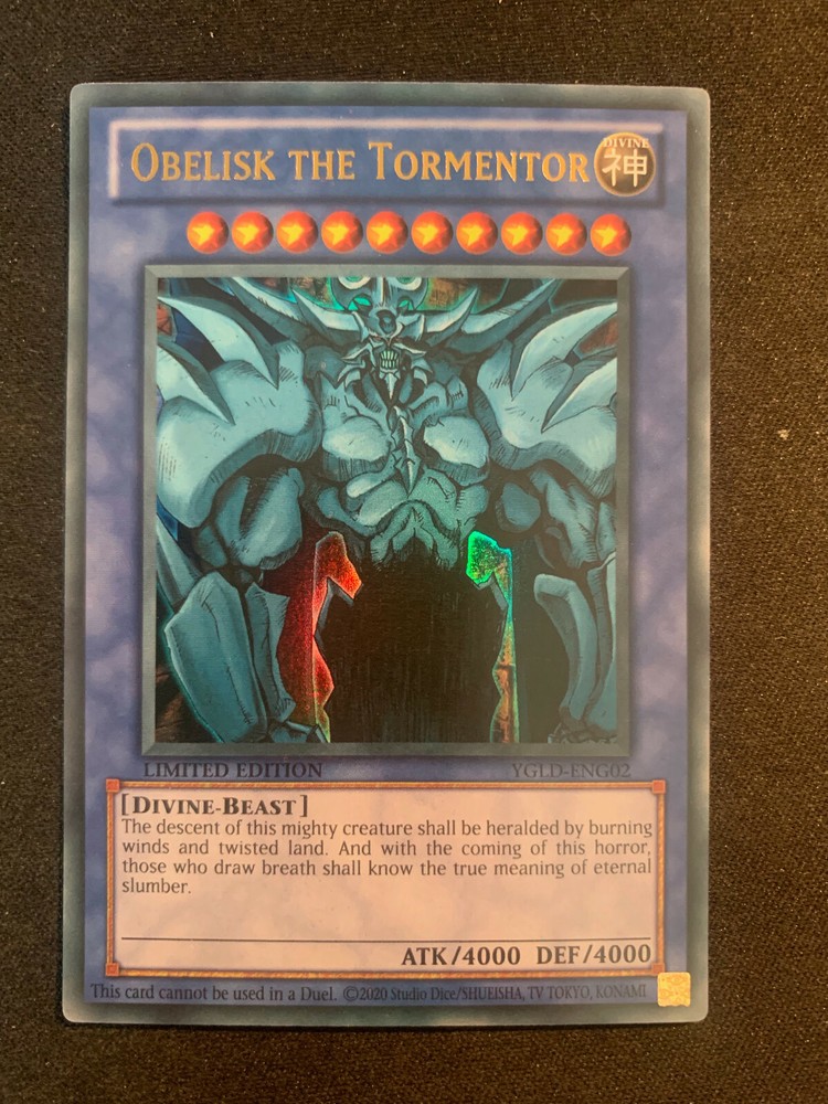 Obelisk the Tormentor - Ultra Rare - YGLD-ENG02 N/M Card is Unlimited Card is in Near Mint Condition Combined Shipping is offered on all of my TCG Listings. When Checking out with multiple cards in your cart, click ‘Request total from seller’. This will allow me to combine the shipping for multiple cards if purchased together. If this does not show up for you, then please message me and I’ll create a listing for your order. Any Further Questions Please Message Me Thanks
