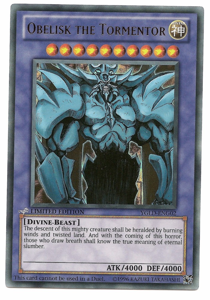 This is an Ultra Rare Holo Divine GOD [Divine-Beast] Obelisk the Tormentor 10 Stars ATK/4000 DEF/4000 Card text: The descent of this mighty creature shall be heralded by burning winds and twisted land. And with the coming of this horror, those who draw breath shall know the true meaning of eternal slumber. Limitation text This card cannot be used in a Duel. Limited Edition YGLD-ENG02 English Mint Condition Totally Original Konami (or your money back!) I will deliver in safe packaging to keep it in perfect condition. Ideal for (non Tournament Players) and Collectors. Check out my other items! I will combine postage costs for multiple purchases. Sign up for my email newsletters by adding my eBay Shop to your favourites Paypal payment preferred - Will attempt to post within 24hrs of payment Personal cheques and postal orders from U.K. bidders are also permitted but will have to wait until they are cleared before shipping takes place. All International purchases need to be paid by Paypal only. (No Bank Transfer)