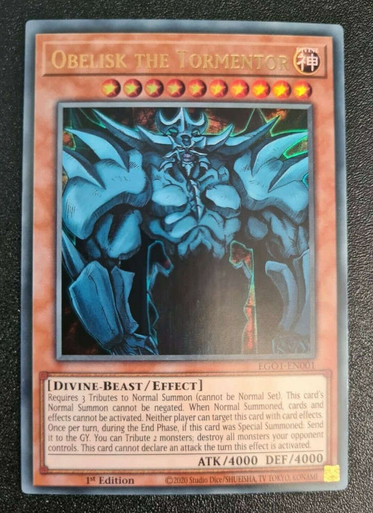 Obelisk the Tormentor Yu-Gi-Oh! EGO1-EN001 1st Ultra Rare Any questions feel free to ask! I also have a Youtube/Twitch channel dedicated to Yu-Gi-Oh! Check it out! youtube.com/darryjamstain twitch.tv/darrenstephenson