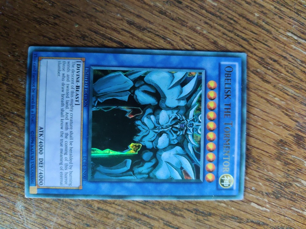 This Obelisk the Tormentor card arrived in great condition for being used! The shipping was fast with USPS First Class, and the card looks just as described. A must-have for any Yu-Gi-Oh! collector—super happy with this purchase!