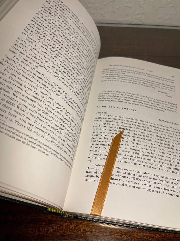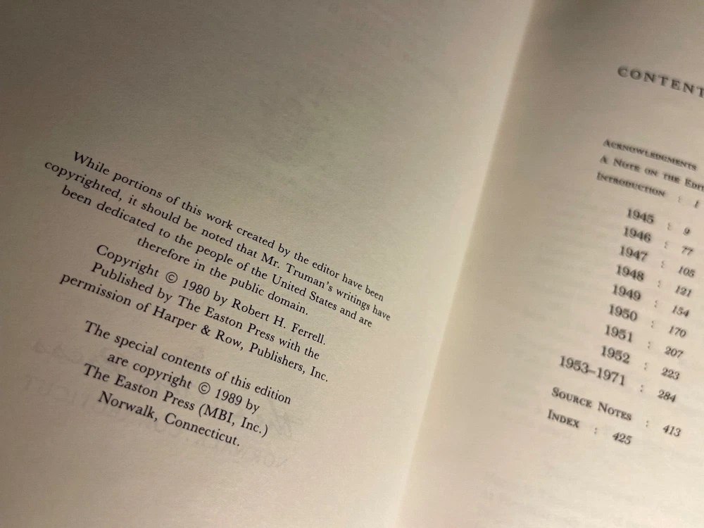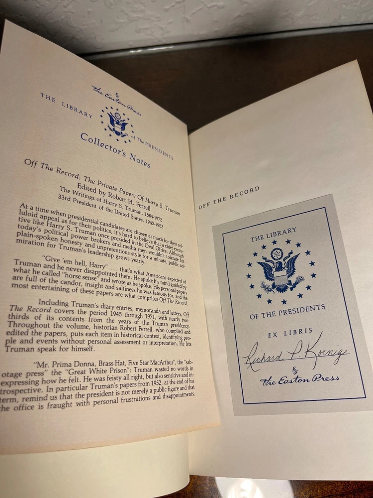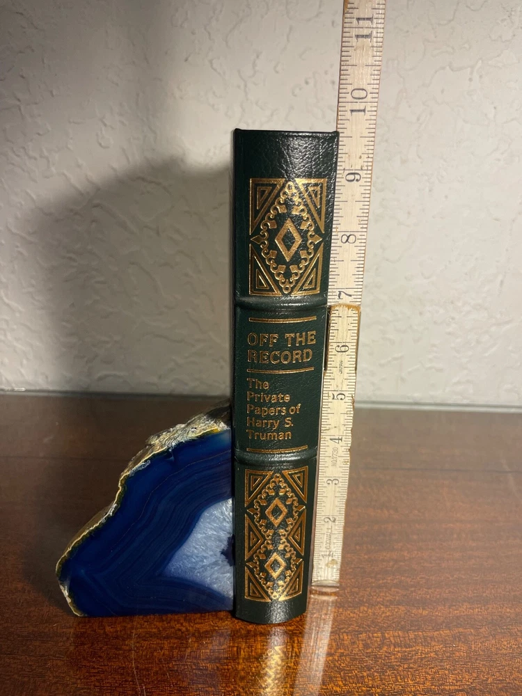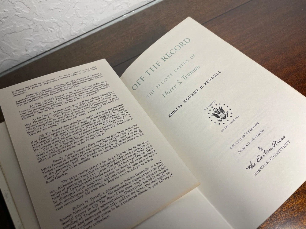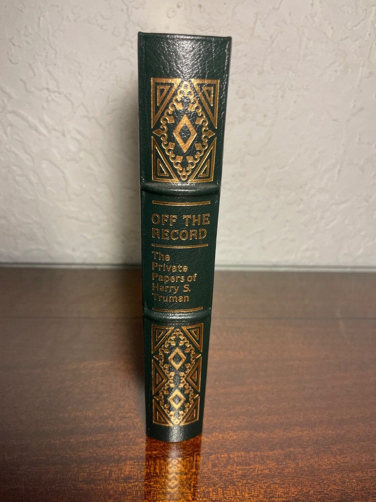 "Off the Record: The Private Papers of Harry S. Truman," the collector's edition. The library of the presidents. The special contents of the edition are copyright in 1989 by the Easton press, MBI, Norwalk, Connecticut. In new, unread condition. The green leather book measures 9.5" x 6.5" x 1.5". Please review photos carefully, as they are part of the description.