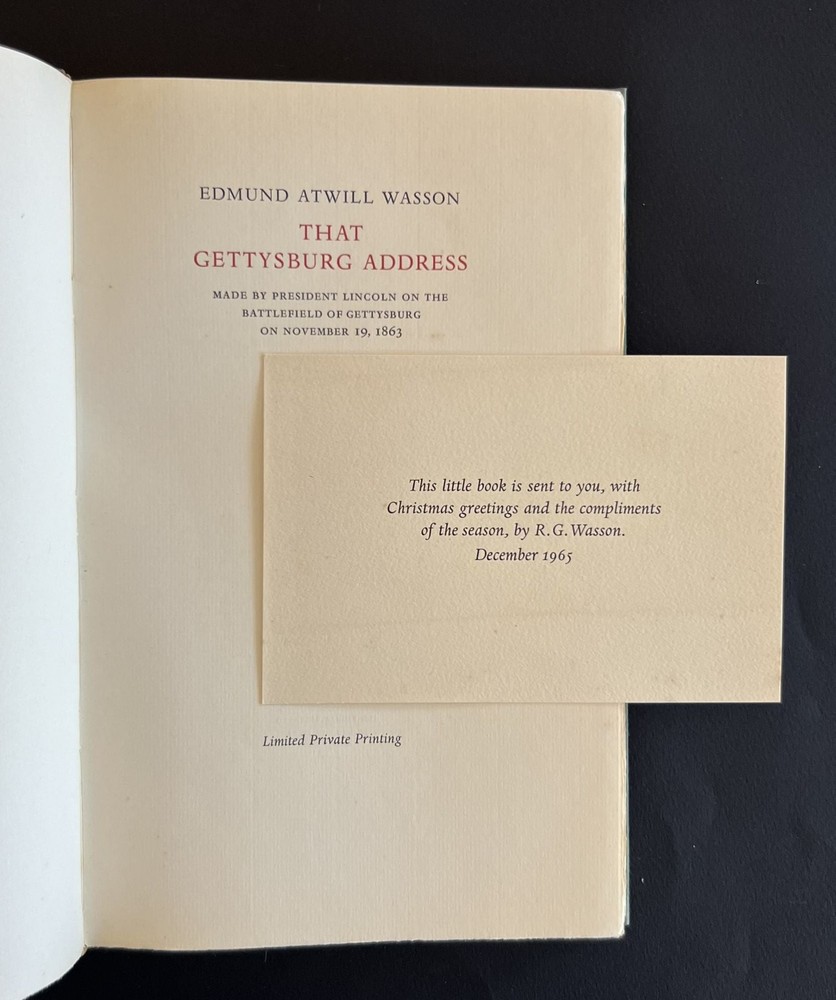 That Gettysburg Address Made by President Lincoln on the Battlefield of Gettysburg on November 19, 1863 Author: [Officina Bodoni] Wasson, Edmund Atwill (1864-1949) | memoir of the author by R. G. Wasson Title: That Gettysburg Address Made by President Lincoln on the Battlefield of Gettysburg on November 19, 1863 Publication: Verona, Italy: Officina Bodoni, 1965 Description: Quarter Leather. Very Good+ binding. Octavo. 108, [4] pp., plates, facsims. Limited edition, one of 225 copies. As issued, backed in green morocco with paper over boards; in publisher's card slipcase. A fairly fresh copy with some light and scattered foxing and a bit of a musty smell; clean throughout. Compliments of R. G. Wasson card laid in. An interesting essay that dissects Lincoln's dedication of the Gettysburg battlefield. An academic essay that asks and answers the question: "Is the Gettysburg Address the masterpiect they would have us believe? We think not; we think it falls far short of it" (p. 9). This essay is followed by a memoir of Wasson by his son. A finely printed piece by Giovanni Mardersteig at his Officina Bodoni. Mardersteig 139. Seller ID: 8789 Subject: Americana, Private Press Michael Pyron, Bookseller, ABAA/ILAB I have been a bookseller and bookbinder for nearly two decades. I offer a general stock with an emphasis in private press and illustrated books, as well as literature and Americana. I take pride in my high level of customer service; if you aren't satisfied with either the book or the service you've received, please let me know about it so I can make it right. Terms All order are shipped with 1 business day upon receipt of payment. The standard shipping method is USPS Media Mail but Priority Mail or UPS shipping is available. Please inquire before payment if you'd like the invoice adjusted to account for a different shipping method. I will accept returns for any reason within 30 days so long as the book or item is returned in the same condition in which it was sent. This listing was created by Bibliopolis.
