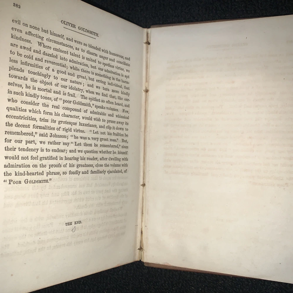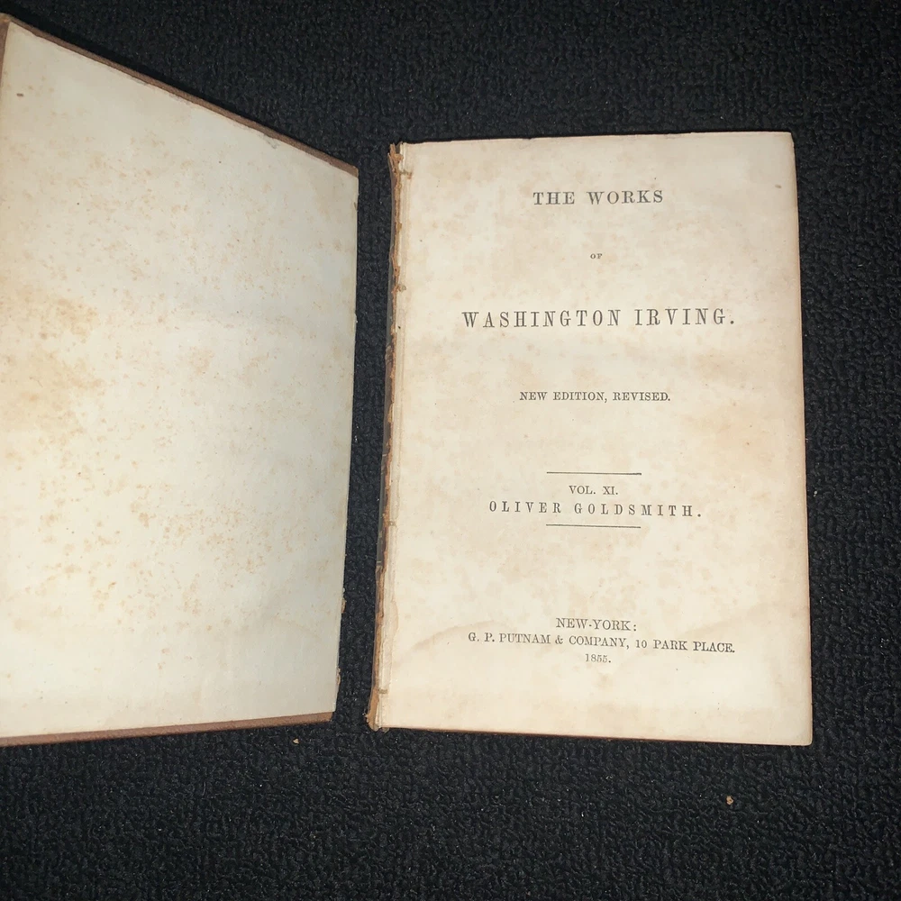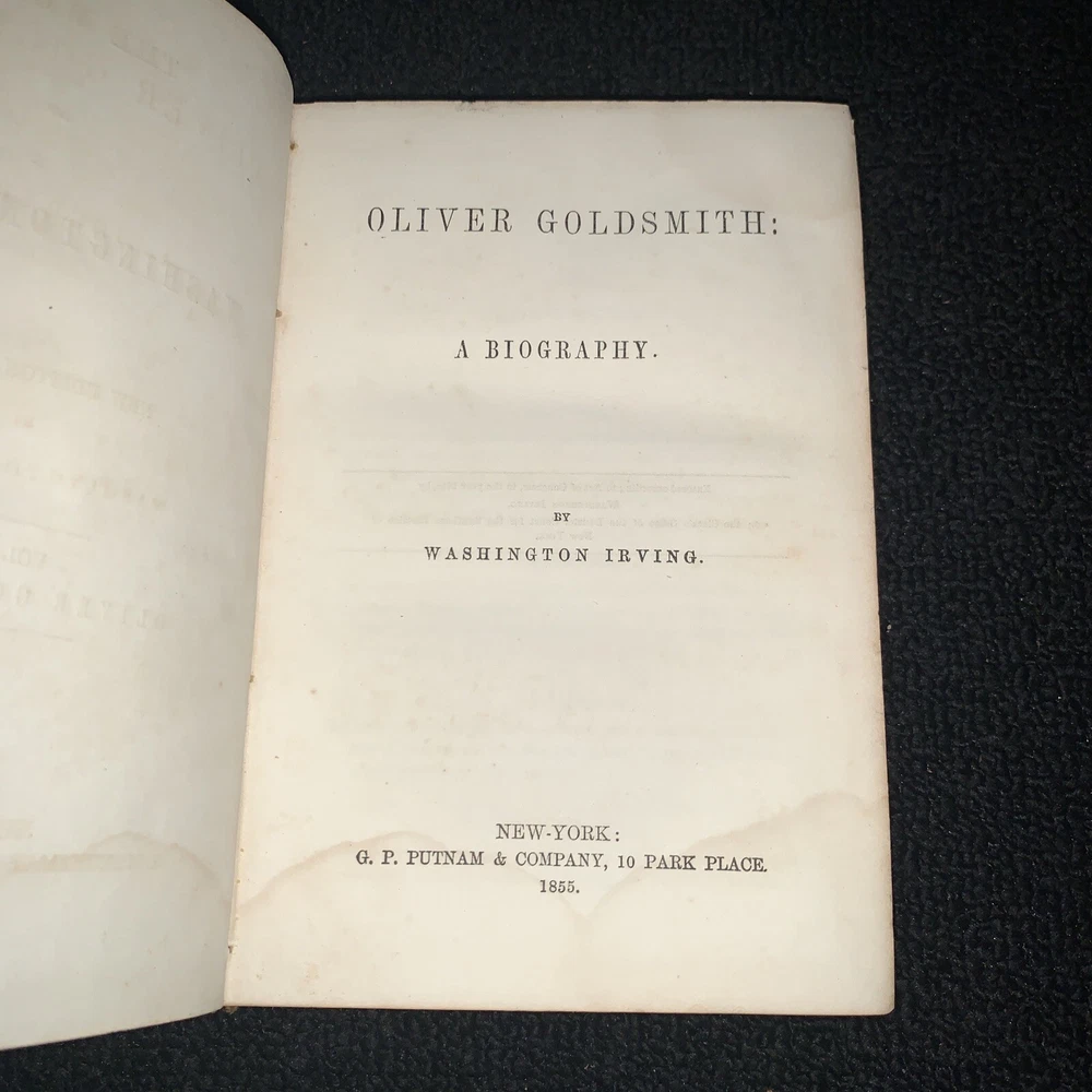 Oliver Goldsmith A Biography by Washington Irving 1855 Old Leather Book. Detached front cover, loose back cover, 382 pages. 7 1/2x5x1 1/4”. Please look at all pictures and ask any questions before purchasing. I do my best to show and describe all flaws so you know exactly what you are buying. I combine shipping on most orders. Follow my store for many more great books and deals. Thanks for looking and supporting my business! Inventory#639