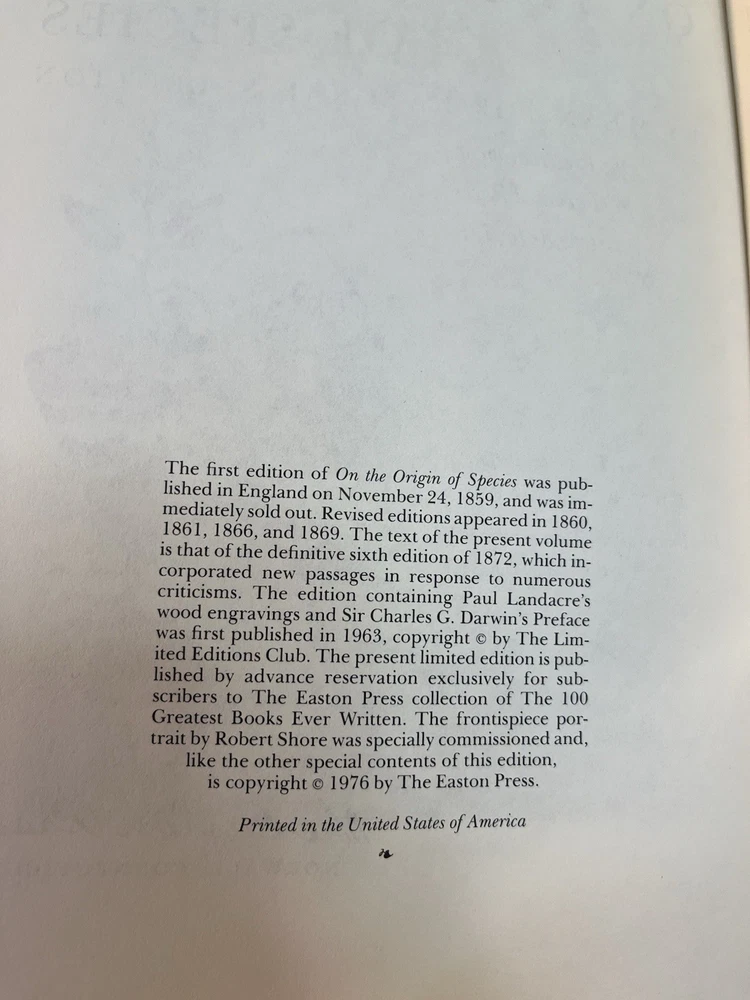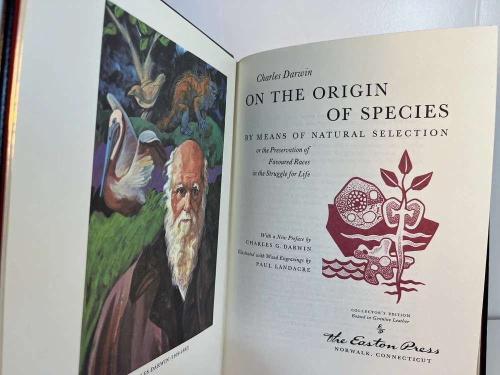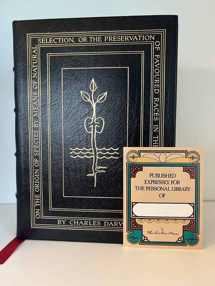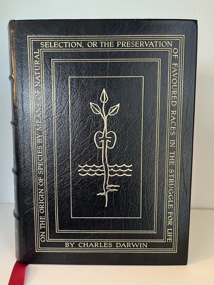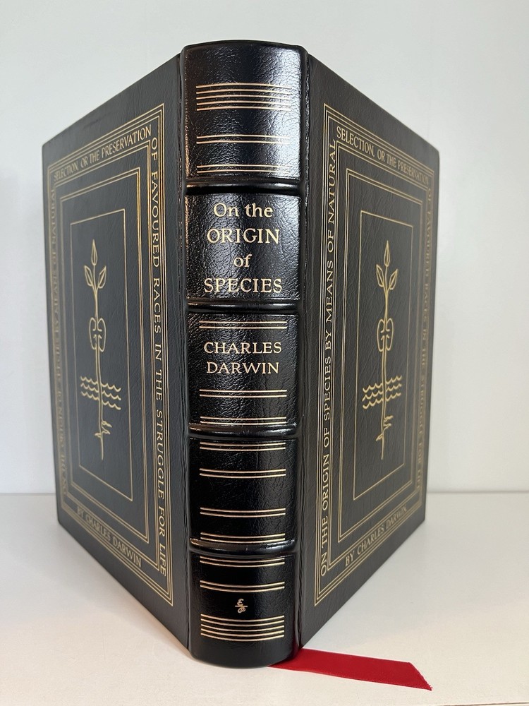 A beautiful book from Easton Press, this one from the 100 Greatest Books Ever Written series. Black leather binding, gilt lettering and blocking on cover, page-end gilt, hubbed spine, attractive red moire endpapers, printed on archival quality acid-neutral paper (won't yellow over time), attached satin marker. From an interview on the Five Best Books on evolution (https://fivebooks.com/best-books/evolution-jerry-coyne/) chosen by evolutionary biologist Jerry Coyne: ...Your first choice, perhaps unsurprisingly, is Charles Darwin’s On the Origin of Species... Tell me why you chose it, when you first read it and why it inspired you. The reason why I chose The Origin is because of all the books that have ever been written on science that are accessible to the layperson, this is the most important. It’s the one book you have to have read if you want to be considered an educated person. An educated person is someone who knows at least a little bit about the major disciplines in human endeavour. And in biology, this is what you need to know – not only historically but also contemporaneously, because Darwin was right, and still is right, about so many things. I first read The Origin as an undergraduate. I’ve read it every year or two since then, so I must have read it 20 times. Each time I read it I get something out of it. I think it was Freud who said that, historically, there have been two great revolutions in human thought spurred by science over history. The first was the [Copernican] discovery that the earth wasn’t the centre of the universe. The second was the discovery that humans are just animals who evolved, like all other animals. And that was from Darwin. To read The Origin properly, you must put yourself in the position of a Victorian reader – who is religious, who thinks humans have been specially created – and see how your worldview is turned inside out by these 500-odd pages of prose. You actually participate, when you read this book, in the revolution in humanity’s worldview, in its self-image, that took place in the latter part of the 19th century. The Origin came out 150 years ago, and it’s still readable, it’s still accessible. Isn’t it quite hard to get through? It is written in Victorian prose. But if you can read George Eliot or Jane Austen, I don’t think you’ll have much trouble with it. The difficulty comes with trying to unpack what he says about science in some places. His chapters on hybridism are pretty dire. Sometimes he gets deeply confused himself. He wasn’t right about everything, and that’s why I recommend the annotated version... Do all biology students read the original Darwin? No, they don’t. You’d be surprised how many evolutionary biologists haven’t read The Origin. Professionals! None of the biology students at the University of Chicago read it. I tried to make my undergraduates read it in class and they balked. They don’t want to read 500 pages of Victorian prose. So then I give them an abridged version, which is not really satisfactory. They don’t even like that. That’s what led me to write my own book. A lot of the evidence in the book is taken from Darwin, but it’s written in a way that makes it more accessible. What I liked about reading Darwin was this strong sense of him as a working naturalist. He came up with this world-changing theory, but he did so by looking at pigeons. It’s the constant and very detailed observation of animals and plants. He was definitely an inductive reasoner, building up the big picture from details. One thing people don’t realise about The Origin is that the rhetoric is magnificent. It’s built on anecdotes and details, all of which are carefully designed to one single end, and it gradually dawns on the reader that Darwin is right. What he’s doing is assailing you from all sides with evidence from different areas of biology – from animal breeding (to show that natural selection can work because artificial selection does), from geography, from embryology. He didn’t have much of a fossil record, so he doesn’t talk a lot about fossils, but he does talk about vestigial organs. And all that comes together to point to one ineluctable conclusion – that evolution happens and probably by natural selection. All the details are carefully chosen from a much larger series of details that Darwin never published. The Origin was supposed to be an abstract for a much larger book, a bit of which still survives and is called The Red Book. He wasn’t going to write The Origin as it stands, but he was forced to because he had competition. Alfred Russel Wallace had come up with the same idea. So Darwin wrote it quickly – otherwise it would have been even longer. It’s the evidence that convinced people more than anything else. You can’t just say, “This is my theory about how things work” and have it persuade people without supporting data. That’s why Darwin was such a success and Alfred Russel Wallace wasn’t. Wallace published a short note in 1858, and that was it. Darwin supported his theory with all these details. It’s just magisterial. He spent years writing to naturalists, to breeders, to obscure people in different corners of the world and collecting all this stuff. Then he built it into an edifice which changed the world. We’re still feeling the repercussions of it today, particularly in America where people absolutely refuse to believe it, simply because it goes against their religious beliefs. Darwin has this nice line in the conclusion, about how “no one now objects” to gravity but when Isaac Newton first proved its existence, Leibnitz said it was an “occult” force and subversive of religion. I guess it takes a long time for people to accept these things. That was part of his rhetorical strategy as well. If you read the famous last line of The Origin, he goes back to the idea of planets cycling around each other and around the sun according to the law 