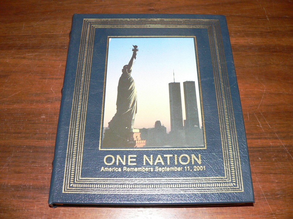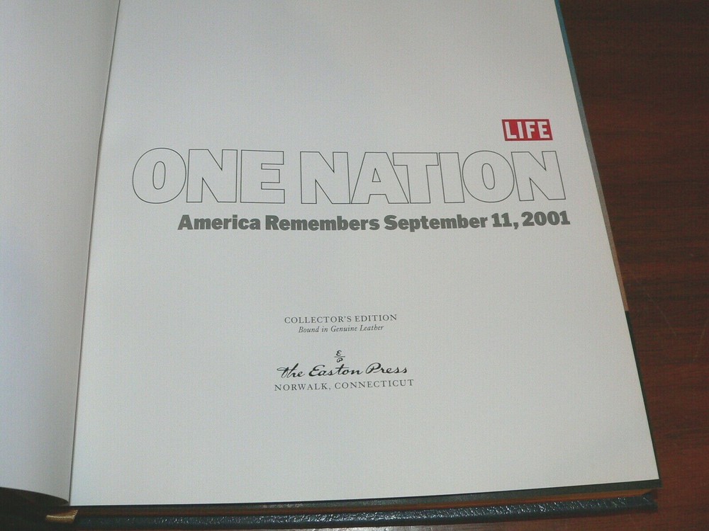 This hardcover Collector's Edition " One Nation, America Remembers September 11, 2001 " comes in very good condition, with minimal handling wear (small spot of damage to top/left corner of cover picture), slight curling of the boards from previous storage conditions, and tight binding (see pictures). The book was compiled by the staff of Life magazine, with an introduction by Rudy Giuliani. This special Collector's Edition was published by Easton Press (1st edition/1st printing). It features a handsome leather-bound hardcover and a ribbon bookmark. I have several great items listed, and would gladly combine shipping for multiple purchases. Feel free to ask any questions or request more pictures. Seller Policies Satisfaction: 100% satisfaction is my goal. Contact me directly through the eBay messages system for fast resolution of any issues that may arise with your purchase. Payment: Immediate payment is welcome and appreciated, though multiple purchases will receive a combined shipping invoice. All eBay approved forms of payment are accepted, with special arrangements to be made in advance (local pick up, etc.). Shipping: There are usually two or more shipping options offered. Additional options can be used at the buyer's request, where applicable. Postage costs are calculated before actual packaging, so the actual cost may vary slightly from what is paid by the buyer. International Sales: I ship Worldwide. Any customs duties, fees, or taxes collected by the destination country are the responsibility of the buyer. It is against Postal regulations to declare merchandise as a "gift".