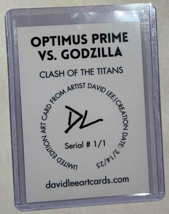 Unleash a mythic showdown with the Optimus Prime Vs. Godzilla Platinum Artist Signed "Clash Of The Titans" Card, a one-of-a-kind collectible that brings together two iconic worlds. This limited edition trading card, serial numbered 1/1, is a true masterpiece by David Lee Art Cards, featuring a stunning platinum plated finish that elevates its rarity and appeal. Signed by the artist David Lee, this card is a must-have for enthusiasts of the comics genre and collectors alike. It captures the epic battle between the mighty Optimus Prime and the fiery Godzilla in a dynamic illustration that stands out in any collection. Don't miss the chance to own this unique piece of pop culture history.