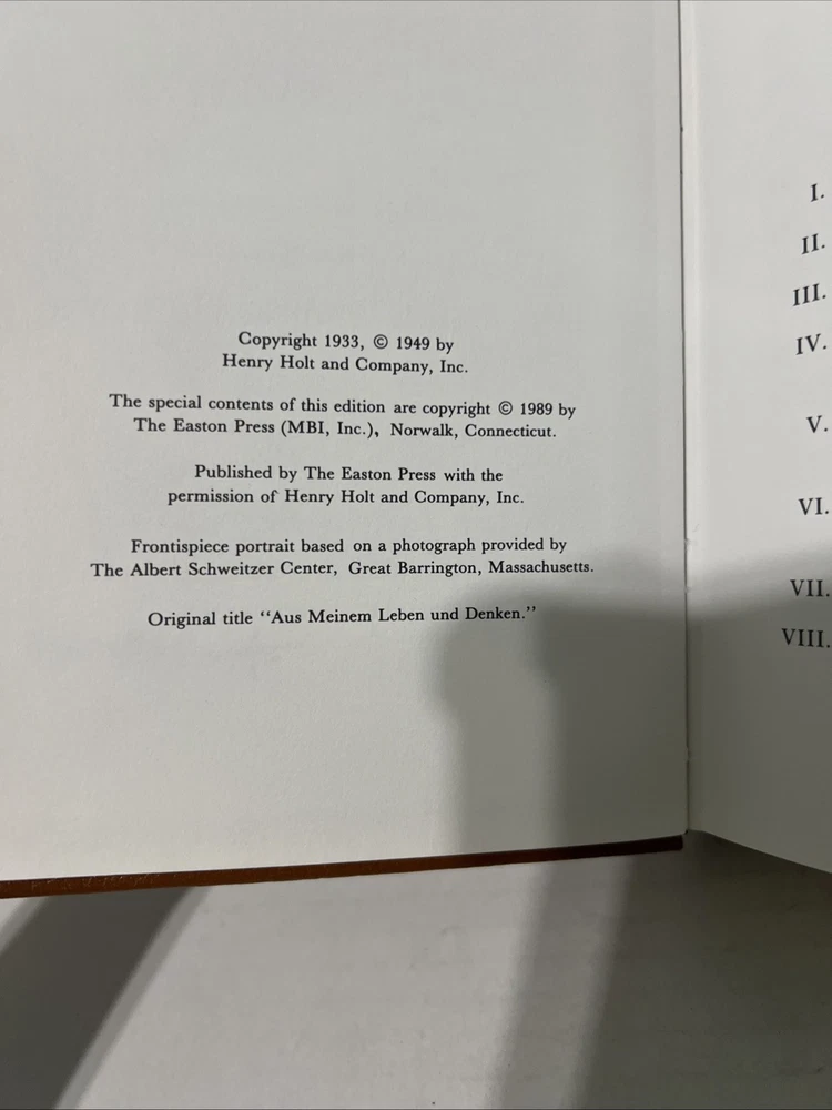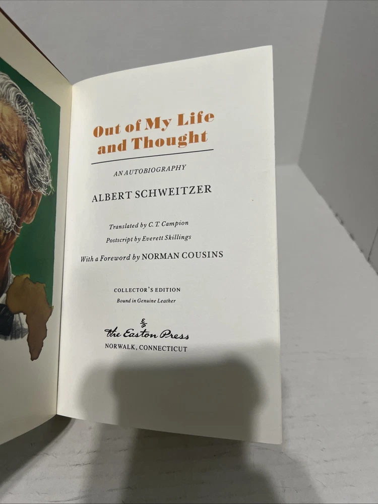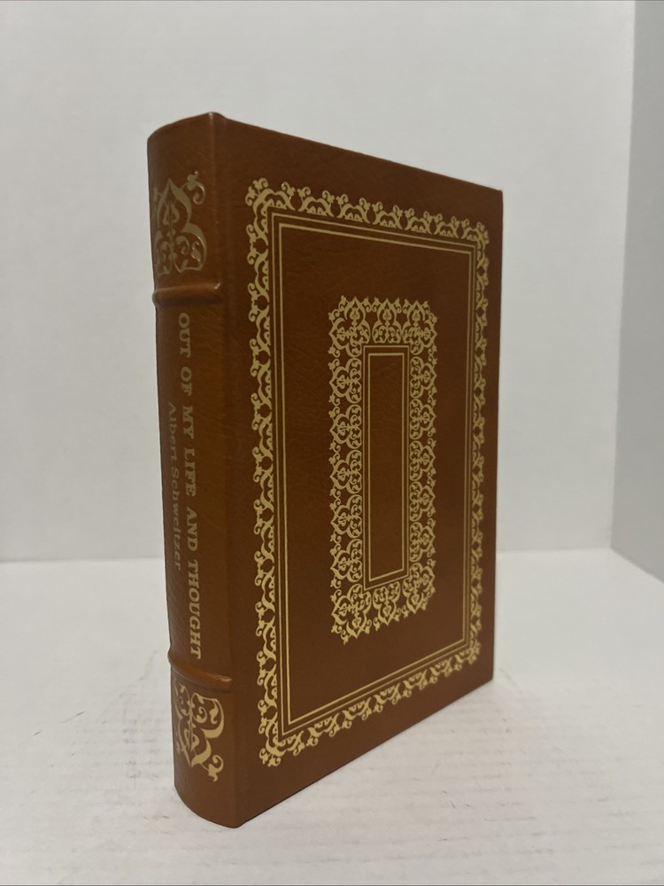 This is a collectible book titled "Out Of My Life And Thought" by Albert Schweitzer, published by Easton Press. The book has a leather binding and is in good condition....