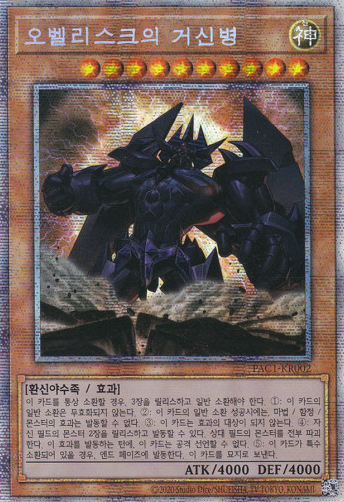 [PAC1-KR002] YUGIOH Prismatic Secret Rare Obelisk the Tormentor Korean MINT Product Description: [PAC1-KR002] YUGIOH Prismatic Secret Rare Obelisk the Tormentor Korean MINT Single Card + Sleeve + Top loader (Case) Mint Condition (Made in Korea) 100% Genuine Product of Konami (Korean Version) All singles cards are never used, fresh from the pack. (also available for combined shipping) Store Policy Items will be shipped from South Korea, 1 ~ 3 business days after order. All the items, we are selling, include manufacturers' warranty and do strict inspection & packaging before shipping. We use Korea Post / Rincos International Priority Airmail. All of our shipping provide tracking number. (Standard & Expedited) Standard: 10 ~ 20 business days (+ Tracking Number) Expedited: 5 ~ 10 business days (+ Tracking Number) We do accept all reasonable request and offer.