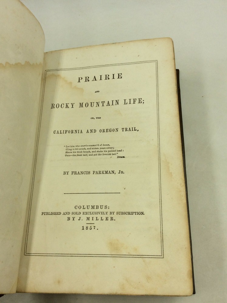 Francis Parkman, Jr. PRAIRIE AND ROCKY MOUNTAIN LIFE; or, the California and Oregon Trail Columbus, OH: J. Miller, 1857. Leather. 640p. A hardcover book that has been REBOUND with a new leather spine and marbled endpapers, preserving the original blind-stamped leather boards. Dampstaining and light foxing inside, but text is still quite legible, with no notes or underlining. The restored binding is quite sturdy. Item #200170 Includes an illustrated title page.