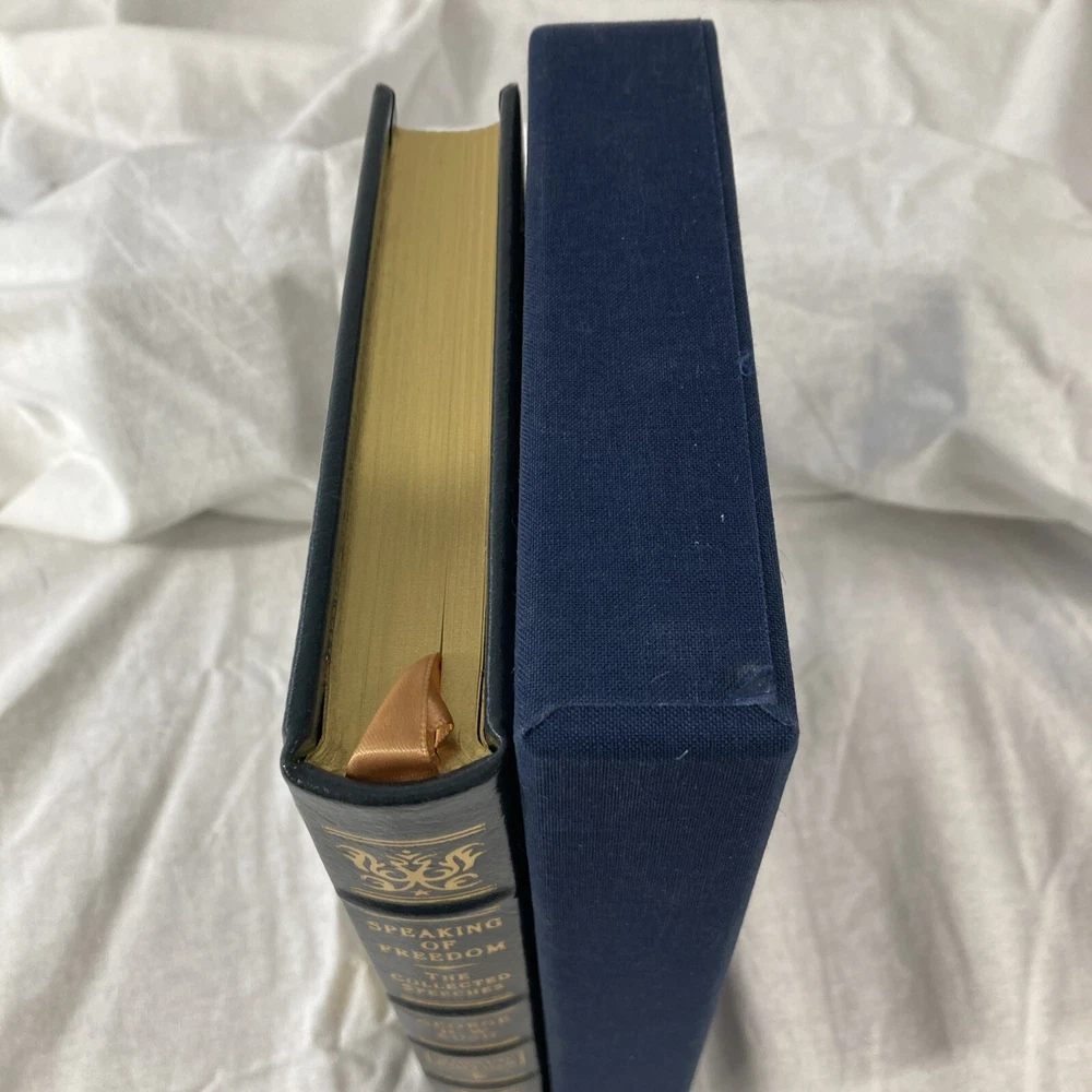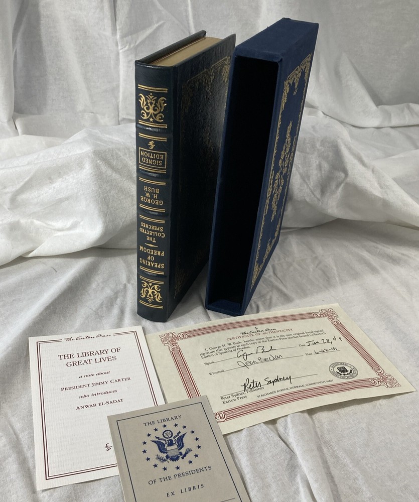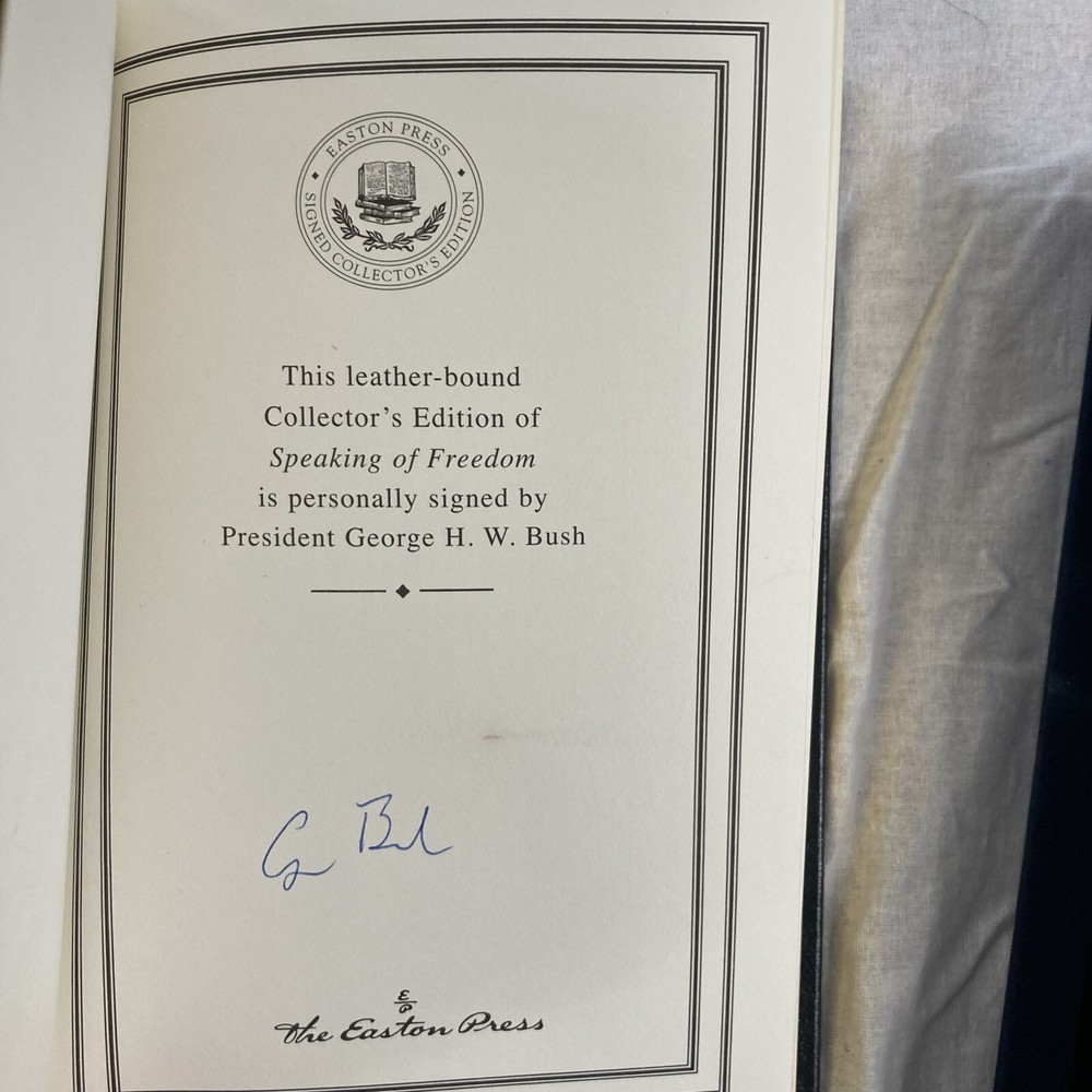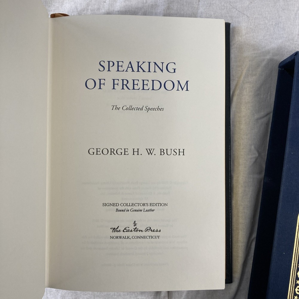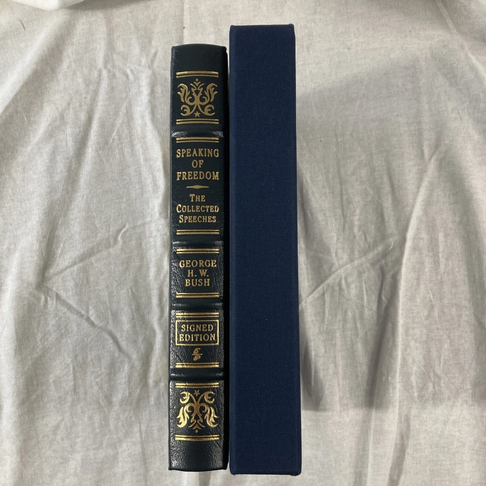 For sale is a signed, limited edition of U.S. President George H. W. Bush's collection of speeches Speaking of Freedom published by Easton Press in 2009. This is a signed, leather-bound edition of this book and is signed by Bush on the book's colophon. The book is in fine condition with no apparent flaws, see photos. The spine and boards are tight and straight. There are no internal markings other than Bush's signature. There is no previous owner's bookplate or markings. The page-edge gilt is in fine condition with only minor wear, see photos. The book's slipcase is in near fine condition with minor shelf wear, see photos. Let me know if you have any questions. Don't forget to take a look at my other signed, limited edition books and prints for sale. Thank you