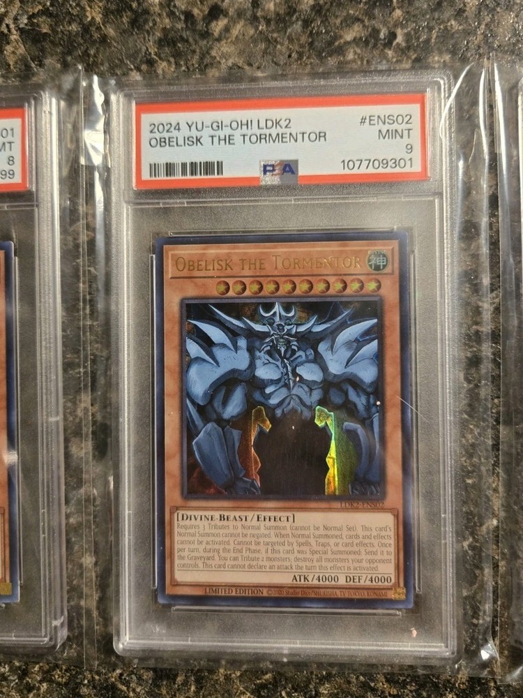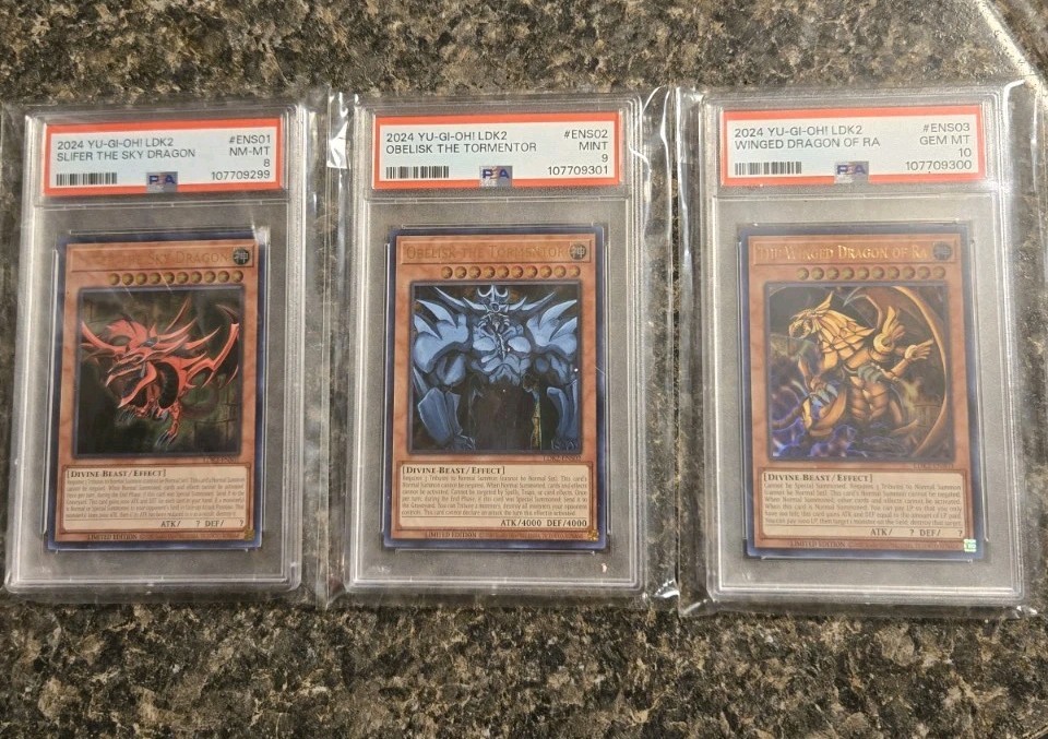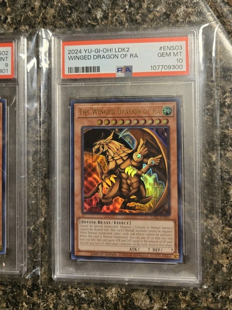 You are buying all 3 cards pictured. Exact cards and numbers. Psa 10. Psa 9. Psa 8. Elevate your Yu-Gi-Oh! TCG collection with the inclusion of The Winged Dragon of Ra from the Legendary Decks II-Limited Edition set. This card, numbered LDK2-ENS03, boasts the prestige of being an Ultra Rare divine-beast type effect card, a must-have for enthusiasts and competitive players alike. The Winged Dragon of Ra is not only a symbol of power in the game but also a treasure for collectors with its limited edition status. With English language print and a sleek design, this card is a standout piece from Konami, ready to make an impact in your deck or display.