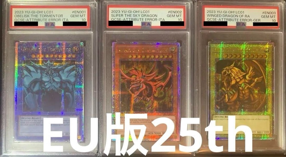 PSA 10 Slifer The Sky Dragon Obelisk Winged Dragon Of Ra Set Yu-Gi-Oh EU version Description Condition: PSA10 We deal in genuine products. If you find out after purchase that your item is fake, we will refund the full amount. We will wrap your item in bubble wrap, pack it in a cardboard box, and ship it securely. Payment Please pay within 5 days after the auction closed. Shipping About other area, please ask me. When you purchase two or more my items, I can send them together and discount shipping cost. Returns Returns are accepted ONLY if the item was not the item described. International Buyers - Please Note: * Import duties, taxes and charges are not included in the item price or shipping charges. These charges are the buyer's responsibility. * Please check with your country's customs office to determine what these additional costs will be prior to bidding/buying. * These charges are normally collected by the delivering freight (shipping) company or when you pick the item up - do not confuse them for additional shipping charges. * We do not mark merchandise values below value or mark items as "gifts" - US and International government regulations prohibit such behavior.