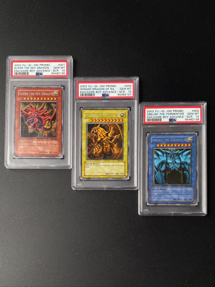 PSA 10 YU-GI-Oh! Promo Slifer the Sky Dragon ,Obelisk the Tormentor, and Winged Dragon of Ra GBI-Secret Rare They Graded 10 Consecutively (DNA Cert in Order) This rare card is a stunning and classic collectors piece from Game Boy Advanced. It will ship within 72 hours of purchase and packaged extremely well to avoid damage. Signed for Delivery is added. Receptive to offers. If you have any questions, please do not hesitate to ask and enjoy your shopping. Goodies Team