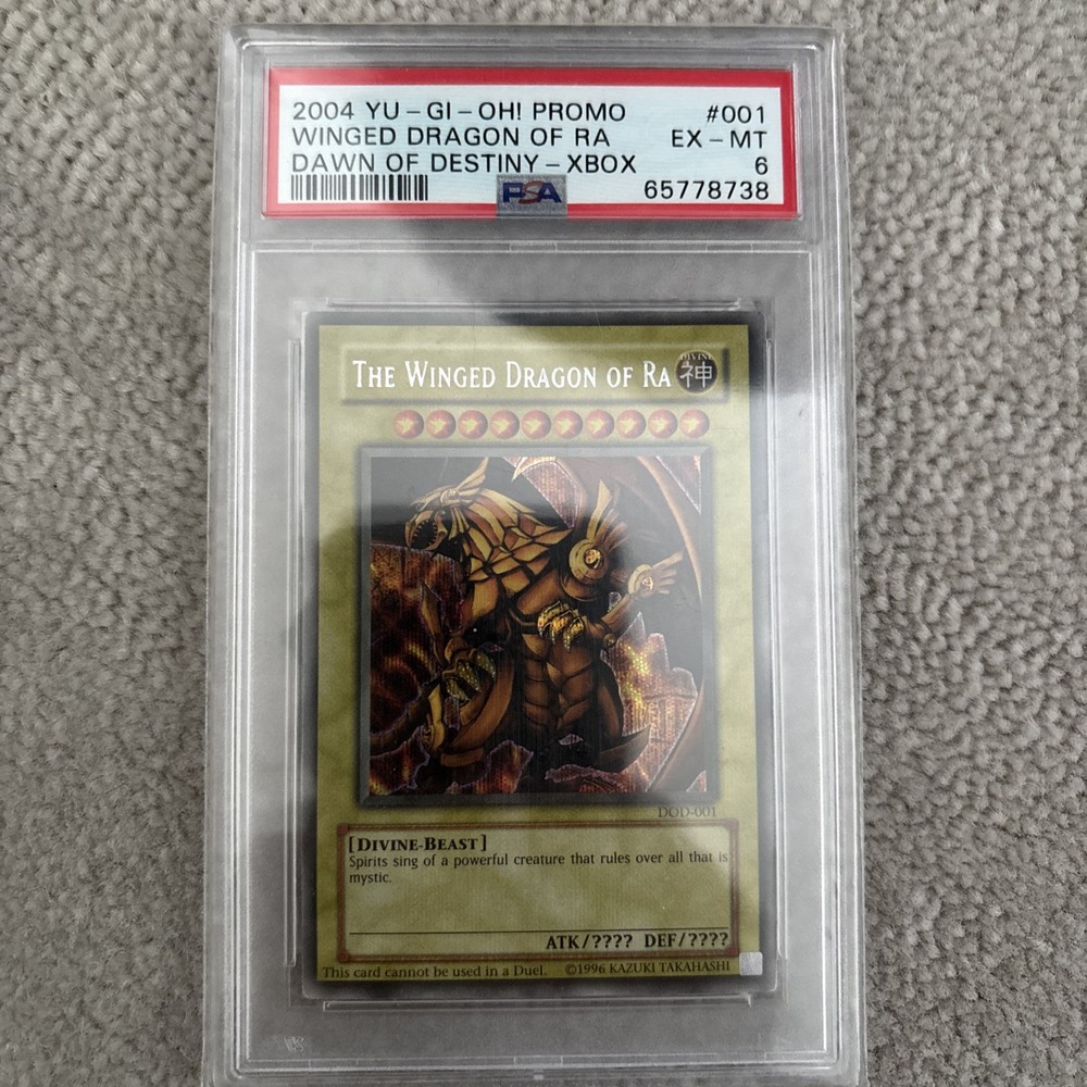 PSA 6 Winged Dragon of Ra - Dawn of Destiny DOD-001 Yu-Gi-Oh! Promo is a highly sought-after collectible card from the Yu-Gi-Oh! Trading Card Game. This Secret Rare Japanese card features the iconic character Winged Dragon Of Ra in a stunning foil finish, making it a valuable addition to any vintage card collection. With its Divine attribute and English language text, this card is a must-have for fans and collectors alike, showcasing the detailed craftsmanship of Konami.