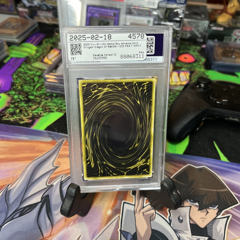 The PSA 7 Winged Dragon of Ra GBI-003 Ultra Rare Promo Game Boy Advanced card is a highly sought-after collectible in the world of Yu-Gi-Oh! TCG. This limited edition card features the powerful monster The Winged Dragon of Ra, and is part of the Yu-Gi-Oh! Duel Monsters International: Worldwide Edition set. The card is graded by Professional Sports Authenticator (PSA) and is considered a valuable addition to any collector's deck. With its exclusive features and vintage appeal, this card is a must-have for fans of the game.
