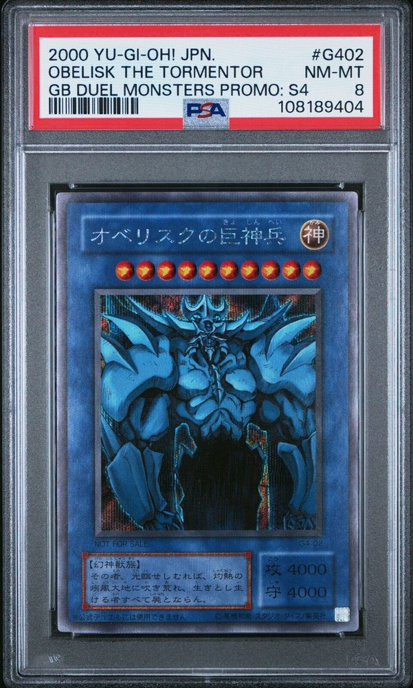 Elevate your Yu-Gi-Oh! TCG collection with the iconic Obelisk The Tormentor, a must-have for both seasoned players and collectors. This rare monster card, with its distinctive Japanese GB Promo print from the year 2000, is a timeless piece of gaming history. Manufactured in Japan, it speaks to the origins of the game and boasts the prestige of its native country. The card's language is in Japanese, adding a layer of authenticity and cultural significance. Obelisk The Tormentor has been carefully evaluated by PSA to receive an impressive grade of 8. This certification assures you of the card's quality and collector's appeal, making it a standout addition to any collection.
