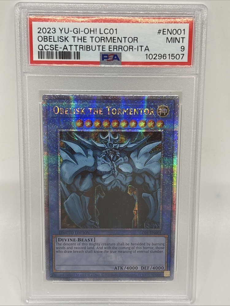 This is a 2023 Yu-Gi-Oh! Legendary Collection card featuring Obelisk The Tormentor, a Divine-Beast monster. It is a Secret Rare card with a foil finish, manufactured by Konami. The card number is LC01-EN001 and it is in English language. This card has a special attribute error related to QCSE.